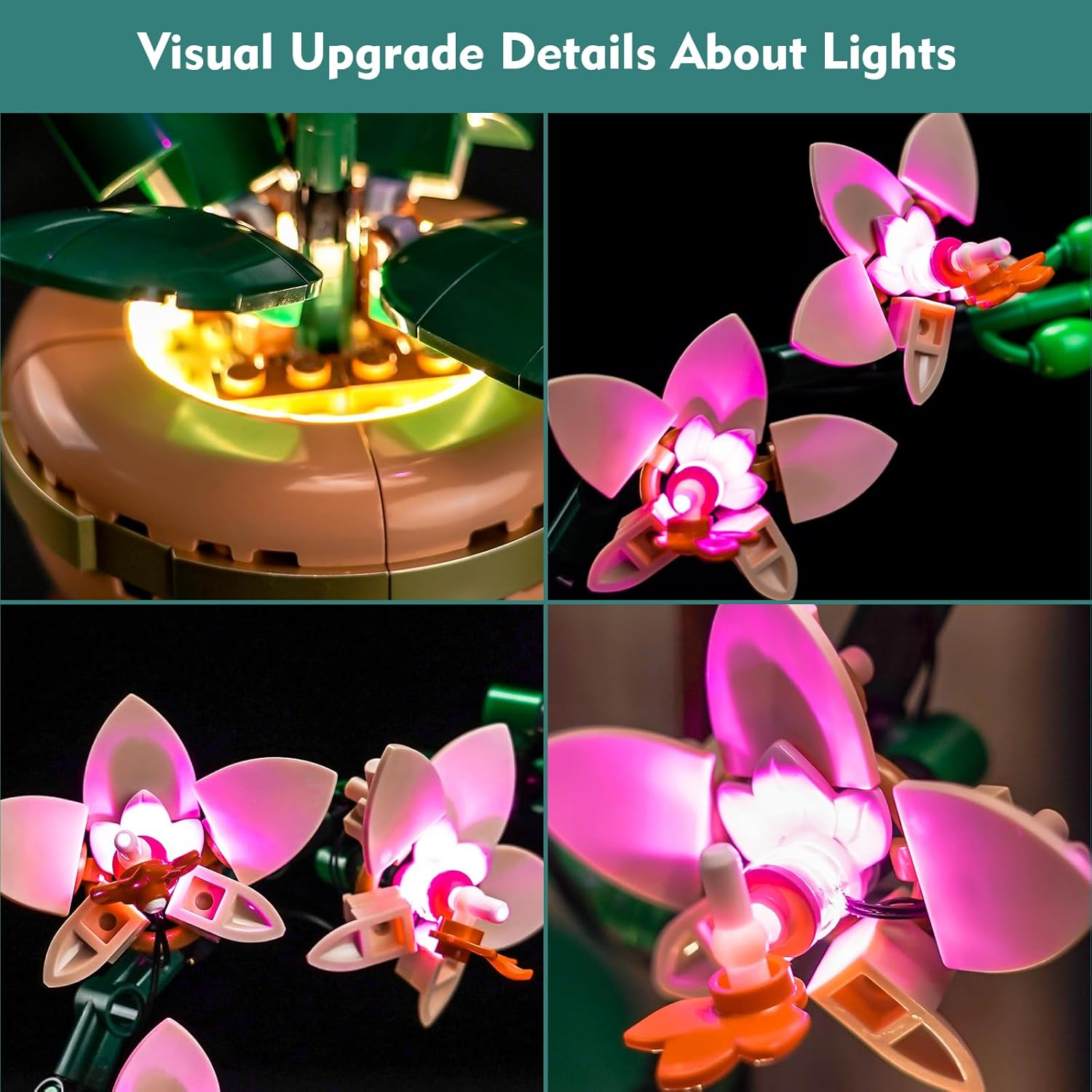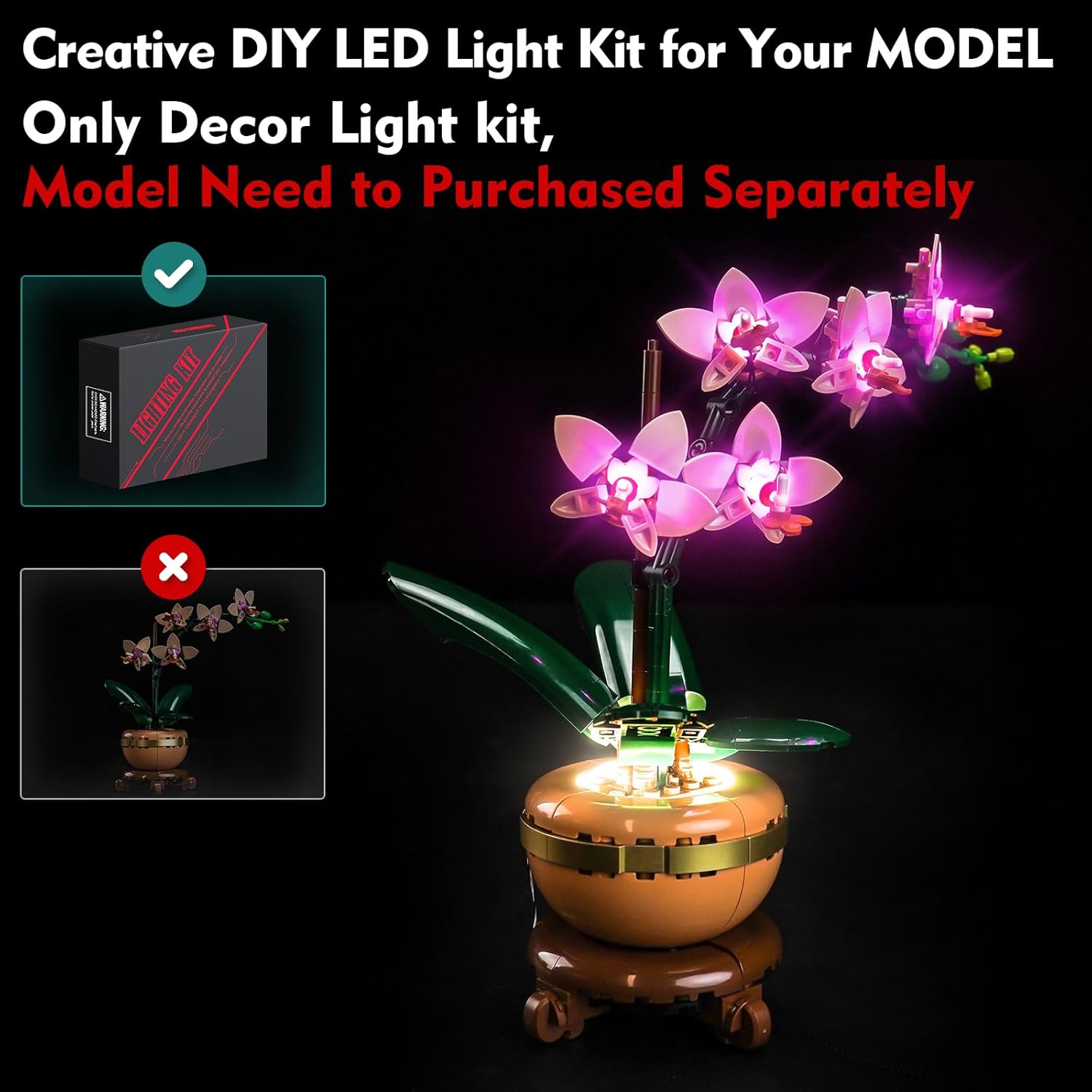 【NO MODEL BUILDING SET】ONLY THE LIGHT KIT FOR SALE, MODEL NOT INCLUDED. This LIGHTING KIT is specially compatible with LEGO Mini Orchid 10343. MODELS SET Need to be Purchased Separately or Already Owned by Yourselves. 【LIGHT UP YOUR BLOCKS】Light up corners of the model with gleam, intense lights, you can see the vivid details inside and outside, lights compatible with LEGO Mini Orchid 10343 make blocks glow in the dark. A special arrangement for Fans & Family collections. 【STEP-BY-STEP INSTALLATION】Provide detailed video/PDF installation instructions(Online) and step-by-step numbered light bags. Just disassemble a few bricks to install the light fixtures! Parts small and not fragile, DON'T pull wires too hard. 【MULTIPLE PLAY】 Light kit Compatible with LEGO Mini Orchid 10343 can be powered by USB (Voltage less than 5V). The lights will be brighter when powered by USB. Please test each light part before assembling. 【QUALITY GUARANTEE】Lighting set compatible with Mini Orchid 10343 is made of high-quality copper lines and ABS plastic, quality check, can be perfectly hidden & Compatible with LEGO blocks. If have questions withe product, please Let us know anytime. Product description The video showcases the product in use. The video guides you through product setup. The video compares multiple products. The video shows the product being unpacked. Are LEGO models included in the Package? No, the package does not contain any lego models or bricks. The model in the image is only used as a demonstration of the lamp accessory effect and is not included in the package. The model needs to be owned by the customer. What should I do after receiving the product package? First, please follow the Online tutorial in the manual to check the lights for completeness & test each lights for proper functioning before installing, then patiently follow the instructions step-by-step to install the lights onto the model. What should I do if I have problems using and installing the light kit? Please let Our Store know when you need it no matter what, we will reply to the doubt and arrange for the replacement of the parts you need.