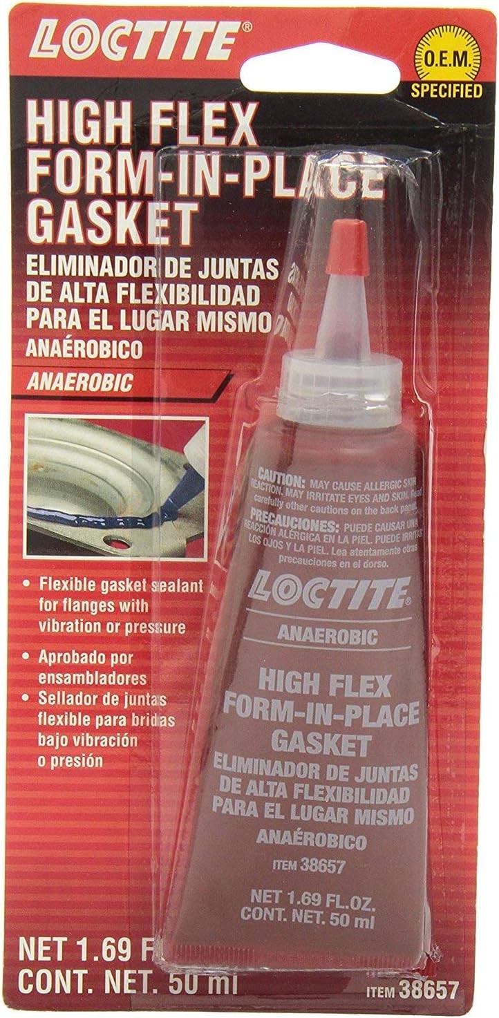 Loctite High Flex Gasket Maker Flange Sealant Product Details Brand: Loctite Style: Compact Item dimensions L x W x H: 8 x 3.81 x 1.2 inches Compatible Material: Metal Item Form: Liquid UPC: 079340386570 Global Trade Identification Number: 00079340386570 Number of Items: 1 Surface Recommendation: Flanges, Gaskets, Pipes, Metal, Plastics Manufacturer: LOCTITE Item Weight: 2.71 ounces Product Dimensions: 8 x 3.81 x 1.2 inches Item model number: 38657 Exterior: Machined Manufacturer Part Number: 38657 Brand: Loctite Style: Compact Item dimensions L x W x H: 8 x 3.81 x 1.2 inches Compatible Material: Metal Item Form: Liquid Anaerobic formed-in-place gasket maker Flexible gasket sealant for flanges exposed to vibration or pressure Withstands high temperatures Engineered to offer more flexibility and high temperature resistance, this gasket maker is ideal for flanges exposed to vibration or pressure. It cures in the absence of air to form a tough, solvent resistant gasket that flexes with flange movement caused by vibration, pressurization, or thermal change.