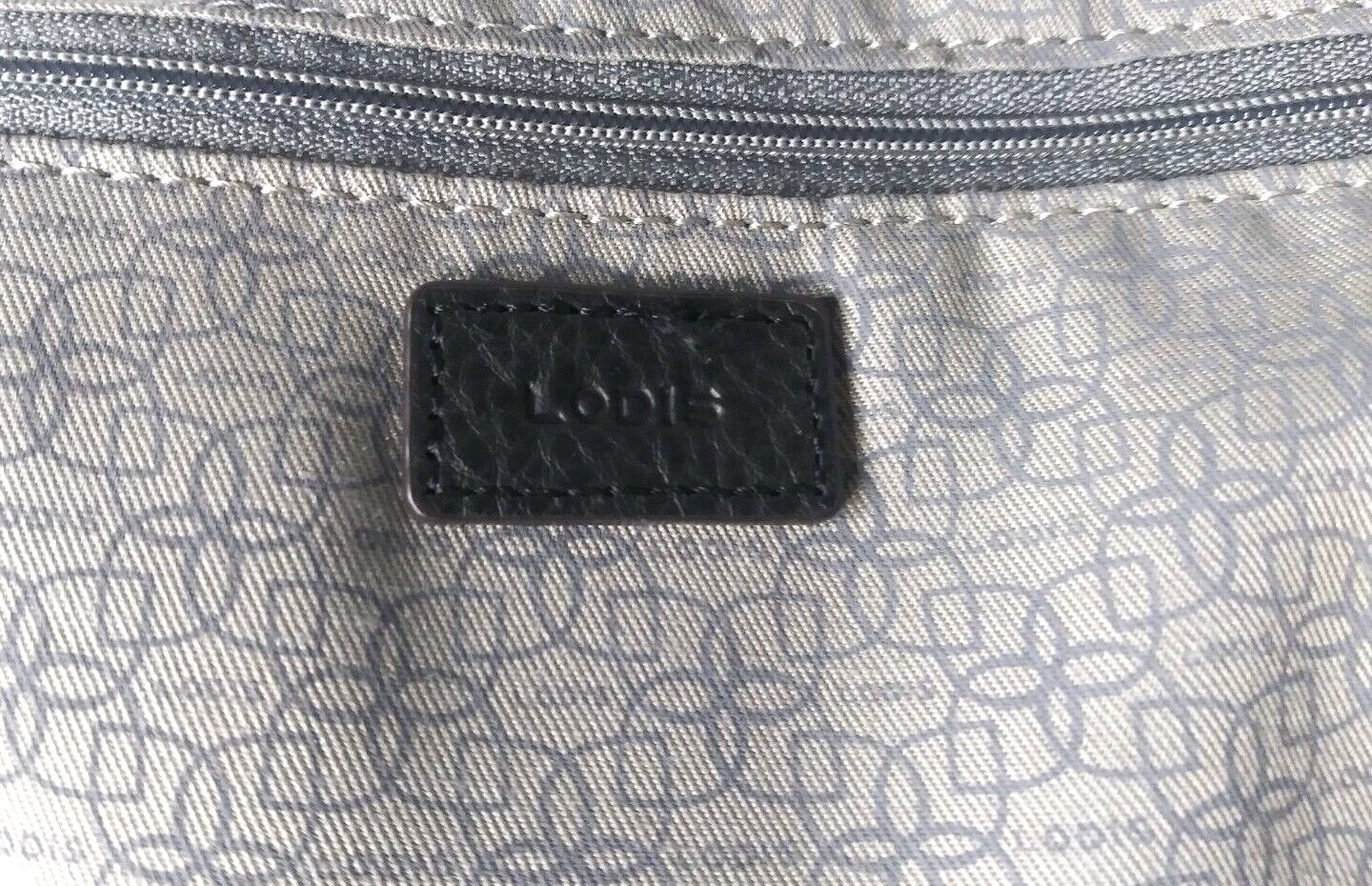 Lodis Kiera Black Leather Tote Work Bag Shoulder Friendly Features Leather body Polyester lining 3 pockets inside Roller board travel pocket outside lightweight shoulder friendly bag Approximately: 15" x 12" x 4" 10" handles drop Good preowned condition. Please see pictures of the bag.