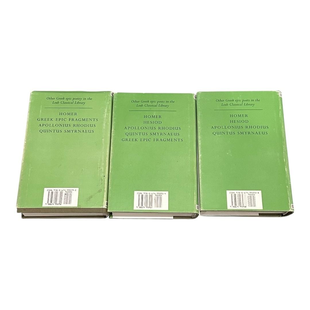 Brand/Publisher: Harvard University Press, issuing the standard green Loeb Classical Library hardcovers with matching dust jackets, presenting original Ancient Greek texts with facing English translations. Set contents: Ten-volume Greek literature and mythology group including Nonnos, Sophocles, Pindar, the Homeric Hymns and related texts, Clement of Alexandria, and Hesiod, all in uniform green cloth hardcovers with green Loeb dust jackets. Nonnos volumes: Dionysiaca I–III translated by W. H. D. Rouse, covering Books 1–15, 16–35, and 36–48 of the late antique epic on Dionysus and his mythic exploits (Loeb Classical Library numbers 344, 354, and 356). Sophocles volumes: Sophocles I and II edited and translated by Hugh Lloyd-Jones, collecting the tragedies Ajax, Electra, Oedipus Tyrannus, Antigone, Women of Trachis, Philoctetes, and Oedipus at Colonus in bilingual Greek–English format (Loeb numbers 20 and 21). Pindar volumes: Pindar I and II edited and translated by William H. Race, presenting the Olympian and Pythian Odes together with the Nemean and Isthmian Odes and surviving fragments, key sources for Greek lyric poetry and athletic victory songs (Loeb numbers 56 and 485). Homeric and related epic volume: Homeric Hymns, Homeric Apocrypha, and Lives of Homer edited and translated by Martin L. West, gathering the archaic hymns to the Olympian gods, later pseudo-Homeric poems, and ancient biographical traditions about Homer (Loeb number 496). Late antique and early Christian authors: Clement of Alexandria translated by G. W. Butterworth, offering a major Christian writer engaging Greek philosophy and religion (Loeb number 92), and Hesiod II translated and edited by Glenn W. Most, containing The Shield, Catalogue of Women, and other fragments that expand the mythological world beyond the Theogony and Works and Days (Loeb number 503). Language and audience: Original texts in Ancient Greek with facing-page English translations, introductions, and notes, intended for adult readers, students, and scholars of classics, ancient religion, mythology, and world literature. Format and design details: Each volume features green cloth boards under a matching green dust jacket with Greek key border, Loeb Classical Library branding on spine and front, and series advertisements on the rear panel and inner flaps; interiors are printed on acid-free paper with clear typography, running heads, numbered sections, and indexes where appropriate. Identifiers and publication details: One visible example shows Nonnos, Dionysiaca Books 36–48 (Loeb Classical Library 356), first published 1940, with copyright and imprint pages noting Harvard University Press and printing on acid-free paper by The Maple-Vail Book Manufacturing Group; ISBN-13: 978-0-674-99393-5. Genre/Topics: Ancient Greek epic and lyric poetry, tragedy, mythological narrative, Homeric tradition (HR), early Christian literature, and classical mythology and literature within the broader field of ancient and world classics. Additional notes: Sold as a complete ten-volume hardcover set with dust jackets only; no slipcase or supplementary media are included, and the volumes are not signed.