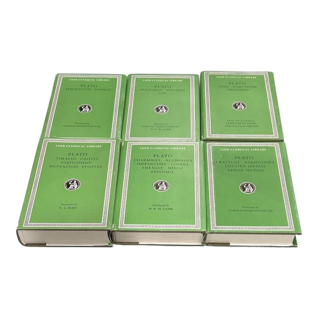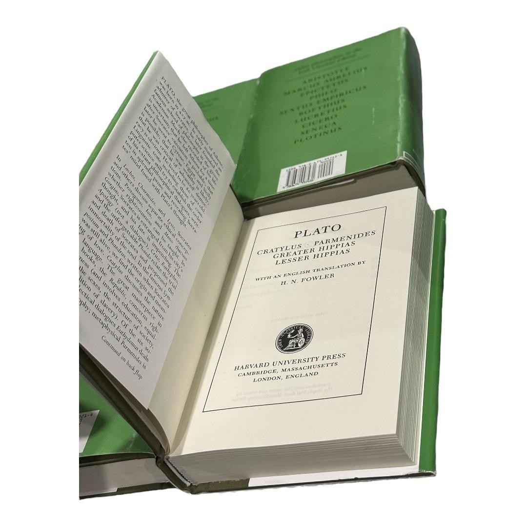 Brand/Publisher: Harvard University Press (Loeb Classical Library), an American academic publisher based in Cambridge, Massachusetts, presenting bilingual classics editions with original Greek texts facing English translations. Title/Set: Loeb Classical Library Plato and Greek Poetry Collection with The Apostolic Fathers Volume II, an eleven-volume hardcover set in matching green dust jackets. Volumes included: six Plato philosophy volumes (Theaetetus; Sophist; Statesman; Philebus; Ion; Lysis; Symposium; Gorgias; Timaeus; Critias; Cleitophon; Menexenus; Charmides; Alcibiades I–II; Hipparchus; Lovers; Theages; Minos; Epinomis; Cratylus; Parmenides; Greater Hippias; Lesser Hippias), four Greek poetry volumes (Greek Iambic Poetry; Greek Epic Fragments; Greek Lyric I: Anacreon, Anacreontea, Early Choral Lyric; Greek Lyric IV: Bacchylides, Corinna, and Others), and The Apostolic Fathers, Volume II. Authors and editors: Primary texts by Plato and various ancient Greek poets and early Christian writers, with English translations and introductions by H. N. Fowler, R. G. Bury, W. R. M. Lamb, Douglas E. Gerber, Martin L. West, David A. Campbell, and Bart D. Ehrman, among others associated with the Loeb Classical Library. Format and design: Durable green cloth hardcovers with gilt spine titling, protected by characteristic Loeb Classical Library green dust jackets bordered with a Greek key pattern and bearing the Loeb Classical Library medallion on the front panels and spines. Text and layout: Dual-language presentation with the original Ancient Greek printed on one page and a facing-page English translation, accompanied in many volumes by introductions, notes, and indexes to support study, reference, and close reading. Content overview: The Plato volumes gather major Socratic and metaphysical dialogues addressing knowledge, language, politics, ethics, and cosmology; the Greek poetry volumes collect early lyric, elegiac, iambic, and epic fragmentary texts that illuminate Archaic and Classical Greek culture; The Apostolic Fathers Volume II presents important early Christian writings in Greek with scholarly English translations and notes. Genre/Topics: Ancient literature, philosophy, Greek poetry, early Christian theology, religious and spiritual classics, and world literature, suitable for coursework, research, or building a reference library in classics and religious studies. Language and audience: Original Ancient Greek texts with parallel English translations intended for adult readers, including students, scholars, and general enthusiasts of classical philosophy, poetry, and early Christian writings. Identifiers and series details: Part of the Loeb Classical Library series issued by Harvard University Press; visible volume numbers on the spines include Loeb Classical Library 123, 164, 166, 234, 201, 167, 259, 143, 461, and 25. ISBNs visible in the photos include Plato Cratylus/Parmenides/Greater Hippias/Lesser Hippias: ISBN 978-0-674-99185-9 (EAN: 9780674991859); The Apostolic Fathers Volume II: ISBN 978-0-674-99608-3 (EAN: 9780674996083). Additional notes: All eleven volumes are hardcovers with dust jackets as issued; no slipcase, supplements, or author signatures are included with this set.