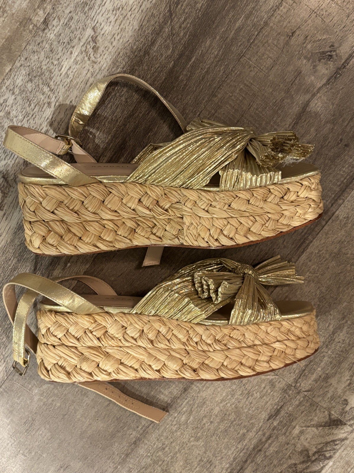 The Loeffler Randall Gaby Pleated Bow Espadrille Women's Size 8 Natural Wedges are stylish and versatile sandals perfect for various occasions such as weddings, parties, or casual outings. These beige sandals feature a solid pattern with a ruffle accent and a pleated bow detail, adding a touch of elegance to any outfit. The slip-on style with a wedge heel and adjustable ankle strap provide comfort and convenience. Made with a synthetic upper material and leather lining, these sandals also feature a leather outsole, ensuring durability and quality. Perfect for women looking for a chic and trendy footwear option.