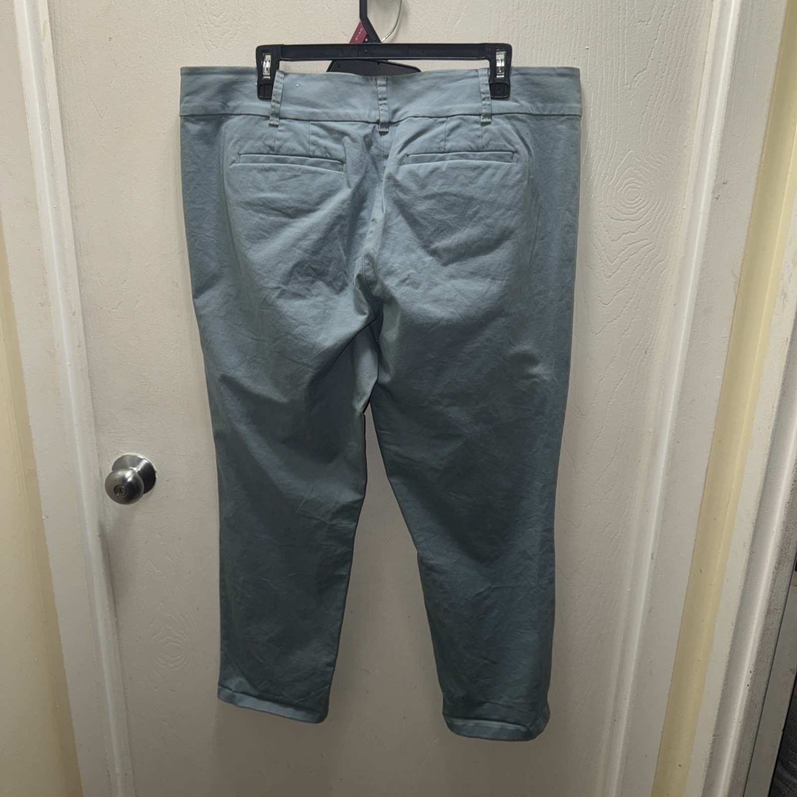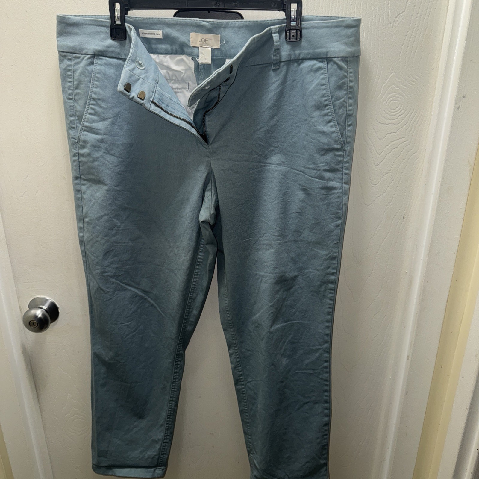 The Loft Light Blue Modern Chino Crop Pants in size 14 are a stylish and versatile addition to any woman's wardrobe. Made of cotton and featuring a flat front design, these pants are perfect for casual occasions in the warmer seasons of summer, fall, and spring. With a straight leg style and a cropped length, these pants offer a preppy and modern look that can be easily paired with different tops for a chic outfit. Perfect for a regular fit, these machine washable pants from the Loft brand are a must-have for any fashion-forward woman.