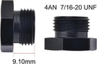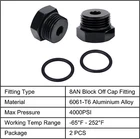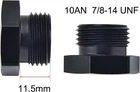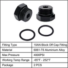 About this item Pack of 2 Size: The thread size of the AN4 hex thread plug fitting is 7/16-20 UNF. Size: The thread size of the AN6 hex thread plug fitting is 9/16UNF. Size: The thread size of the AN8 hex thread plug fitting is 3/4-16 UNF. Size: The thread size of the AN10 hex thread plug fitting is 7/8-14 UNF. Size: The thread size of the AN12 hex thread plug fitting is 11/16-12 UNF. Seal: the ORB is sealed with an O-ring. Parameter: Working pressure: 1500psi; Working temperature: -65°F-252°F; O-ring can withstand temperature: 122°F-140°F. Material: Made of aluminum alloy 6061-T6 and NBR rubber. Application: Widely used in fuel rail, fuel pressure regulator, radiator, etc.