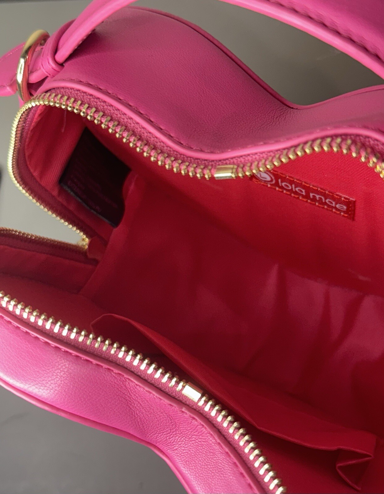 Pink heart shaped Lola Mae purse/handbag. Size: 8' x 3" x 6.50" New without tags. Holds cell phone, small wallet and cosmetics. Good Quality PU leather and gold tone zipper. Smoke free and pet free home. This structured heart shaped bag is good for night out, parties, shopping, concerts,festivals and more. The bag's interior is lined with pink nylon material, adding a touch of elegance to the purse. The bag's exterior is finished with a beautiful brushed texture, making it perfect for any stylish woman, teen or pre teen.