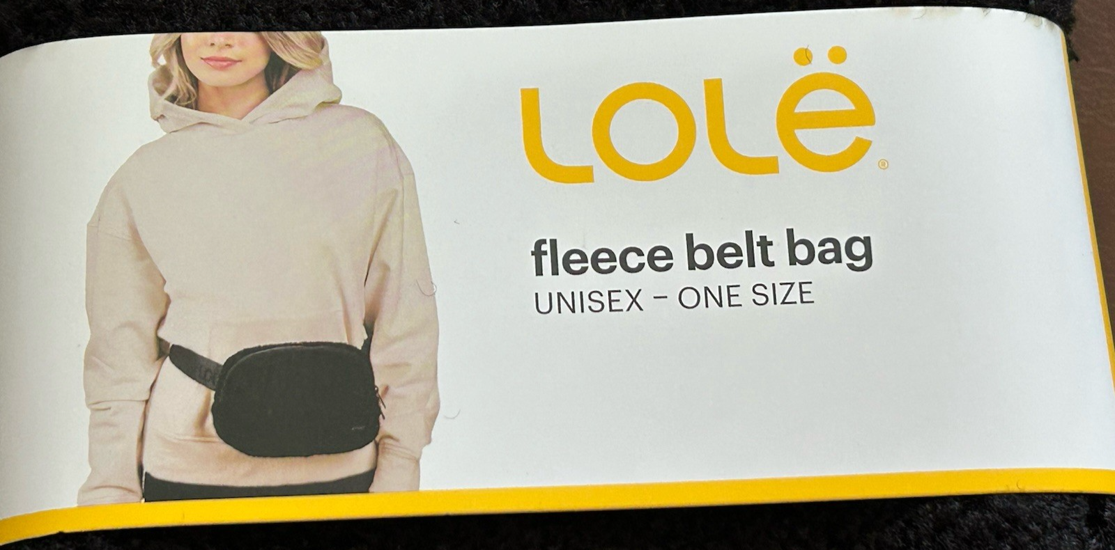 NEW LOLE Unisex Belt Bag Black fleece one size adjustable. Zippered pocket for valuables. 3 mesh storage compartments, key clip,adjustable strap. 8.5" wide x 5.5" tall.(the bag). strap is 25.5" -45.5". Nice, comfortable bag to wear over over shoulder or around your waist.