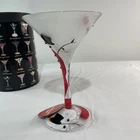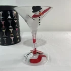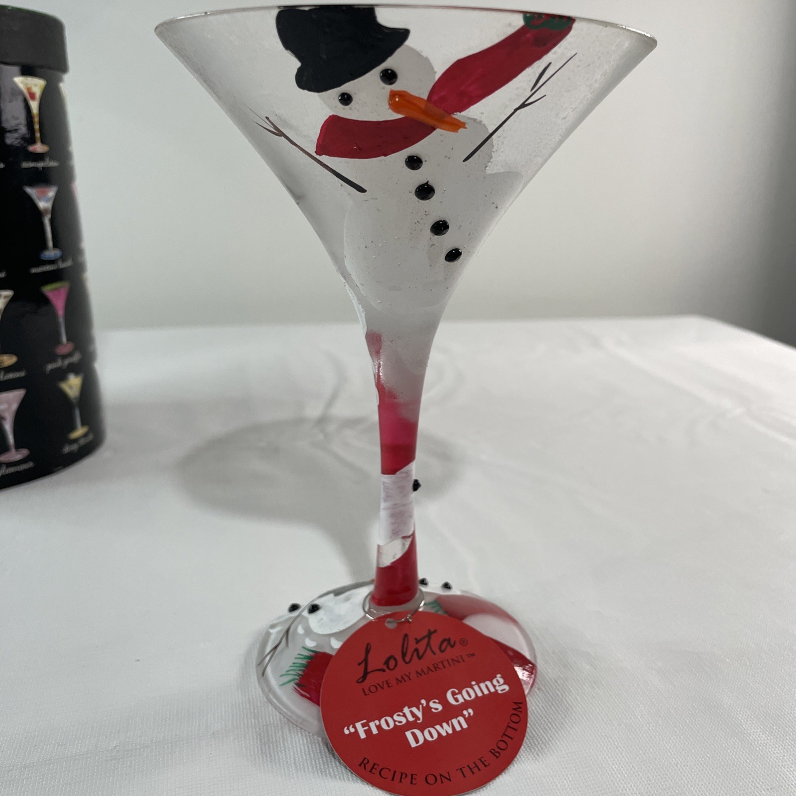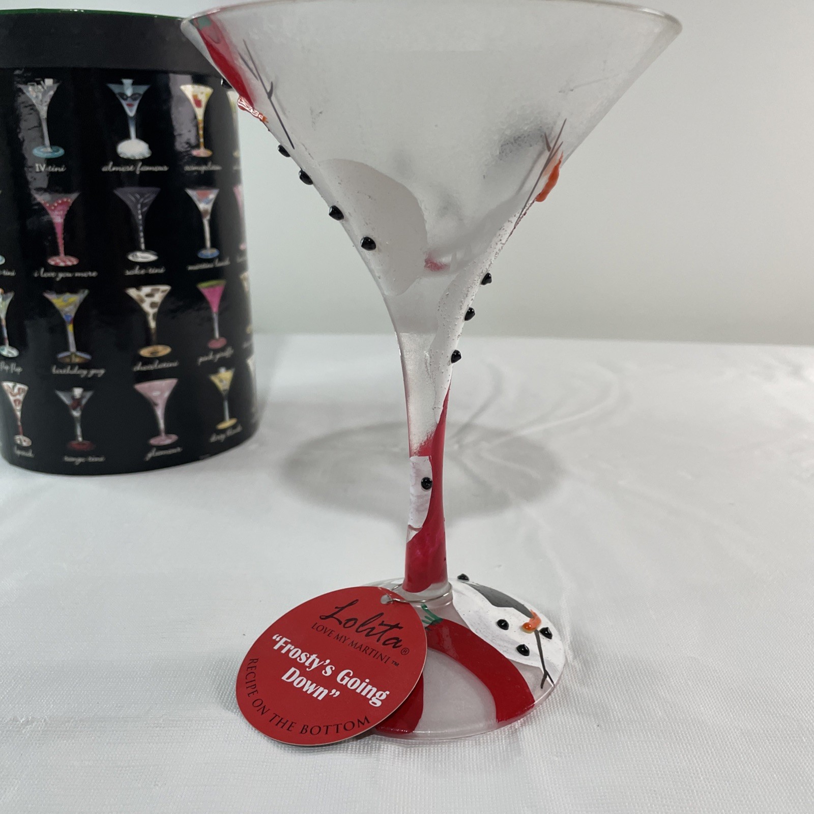 The New Lolita The Martini Collection "Frosty's Going Down" 10 Oz. Martini Glass is a novelty, hand-painted martini glass featuring a colorful multicolor design perfect for all occasions. This Christmas-themed glass comes in a presentation box and includes a recipe for a festive touch. The tapered shape and 10 oz capacity make it ideal for serving your favorite martini to one lucky adult in your household. Hand wash only to preserve the decorative design and collectible brand. With tags. Looks as if was displayed previously.