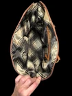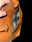 See photos for imperfections. The handles stitching has come loose. This London Fog Fenwick purse is a stylish and practical addition to any wardrobe. With its rich camel/cognac color and solid pattern, it can easily transition from travel to workwear. The purse has a rectangular shape and measures 16 inches in width, 11 inches in height, and 5 inches in depth, making it a large-sized purse that can accommodate all your essentials. It features a zip closure, double handles, and gold hardware, adding a touch of elegance to the classic style. The faux leather exterior and polyester lining make it a durable and comfortable choice. The purse also comes with a built-in wallet, making it a versatile and convenient accessory for any occasion.