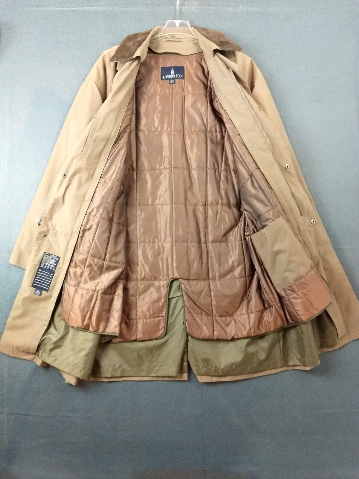 London Fog Men's XL Long Rain Coat Single Breasted Removable Liner Suede Collar Great pre-owned condition, light wear from use/handling, please view all pics. Shell Made of 66% Cotton, 36% Nylon Removable Lining Made of 100% Polyester Removable Collar Made of Genuine Leather - Suede Color: Medium to Dark Khaki for Best Color Accuracy See Picture 9 Approximate Measurements: Shoulder Width Back Seam to Seam: 48 in Chest Width Front Armpit to Armpit: 54 in Sleeve Length from Under Arm Inseam: 20 in Overall Length from Back Collar Seam: 43 in Please Refer to All Pictures for Complete Description Details of Item.