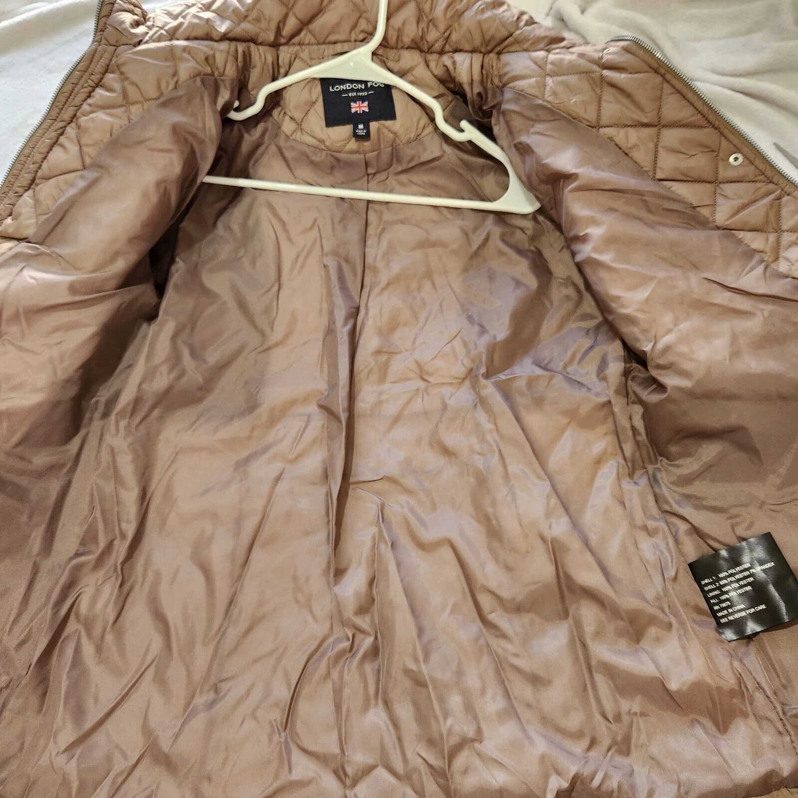 New Without Tags!! Stay stylish and dry with this London Fog women's jacket. Made from water-resistant polyester, this quilted jacket is perfect for any rainy day. The removable hood and medium size make it a versatile addition to any wardrobe. The brown color and London theme add a touch of sophistication to this basic jacket. Ideal for any woman looking for a fashionable and functional piece, this jacket is sure to impress.