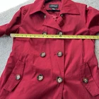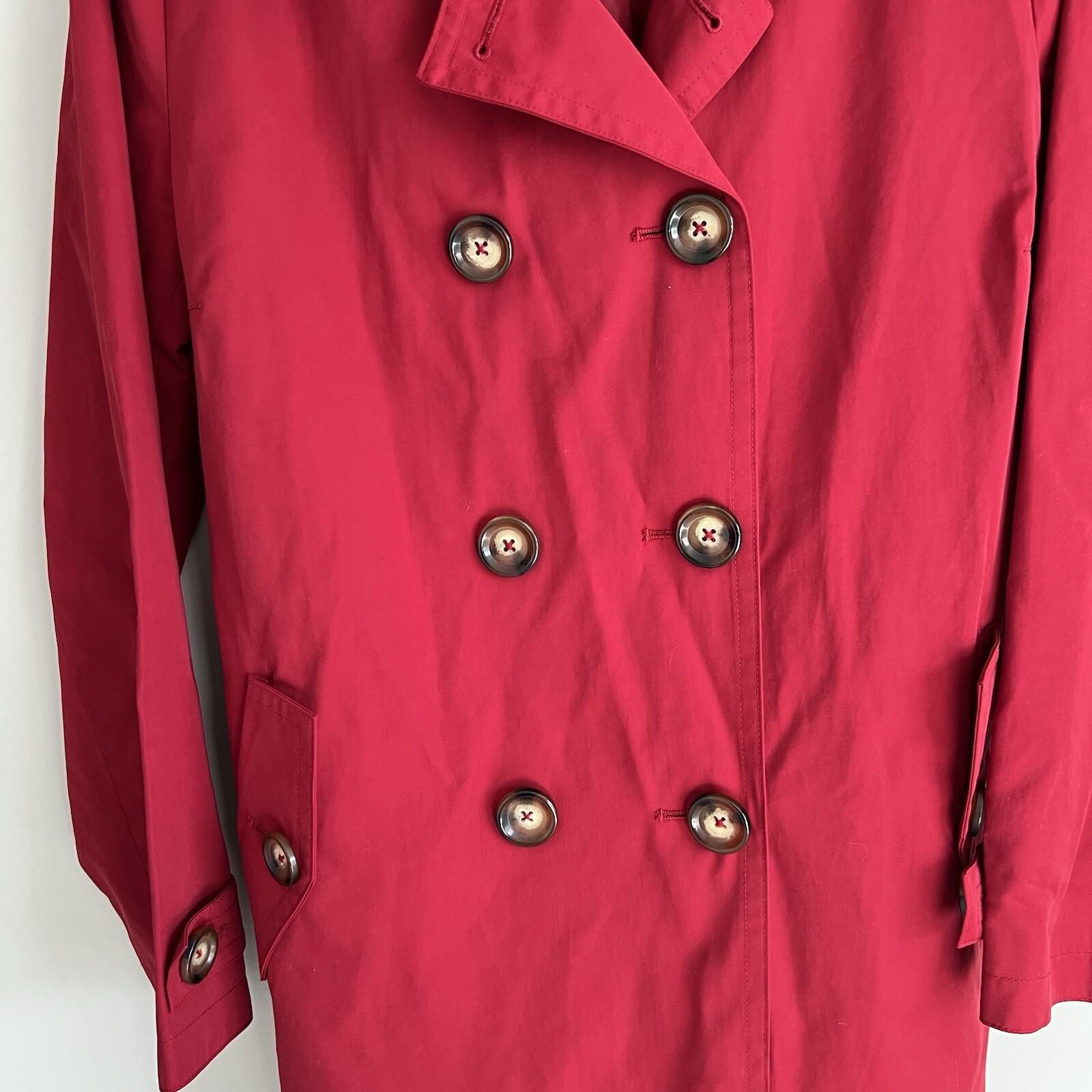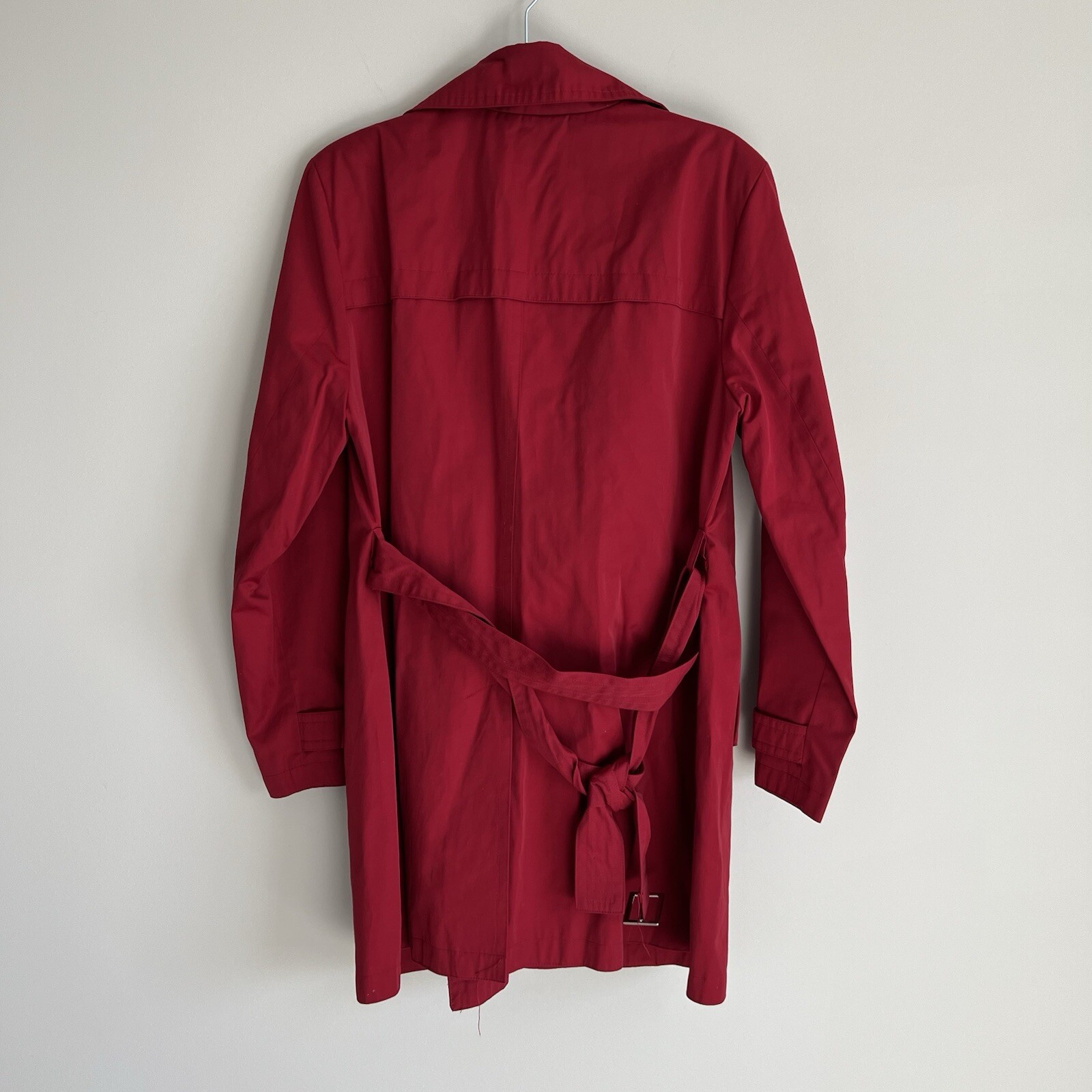 London Fog Women’s Red Raincoat Belted Trench Coat Large Button front Belted Double breasted Collared Two front pockets MIDI length No rips stains or pulls Comes from a smoke free pet free house Size large measures 20.5” pit to pit and 33.5” in length