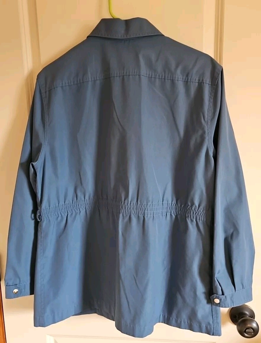 This London Fog women's jacket features a mid-length design with a solid blue Lombard cotton outer shell. It has a vintage style with double zip and button closure, accented with a classic London Fog theme. The jacket is lined with polyester, making it lightweight and water-resistant, suitable for various occasions like travel, parties, or casual wear. This size Large jacket also includes multiple pockets for added functionality, catering to a bohemian outdoor look with a touch of city style. Pre-owned Good used condition Missing the hood Some of the paint is worn off on the hardware. Please see pics