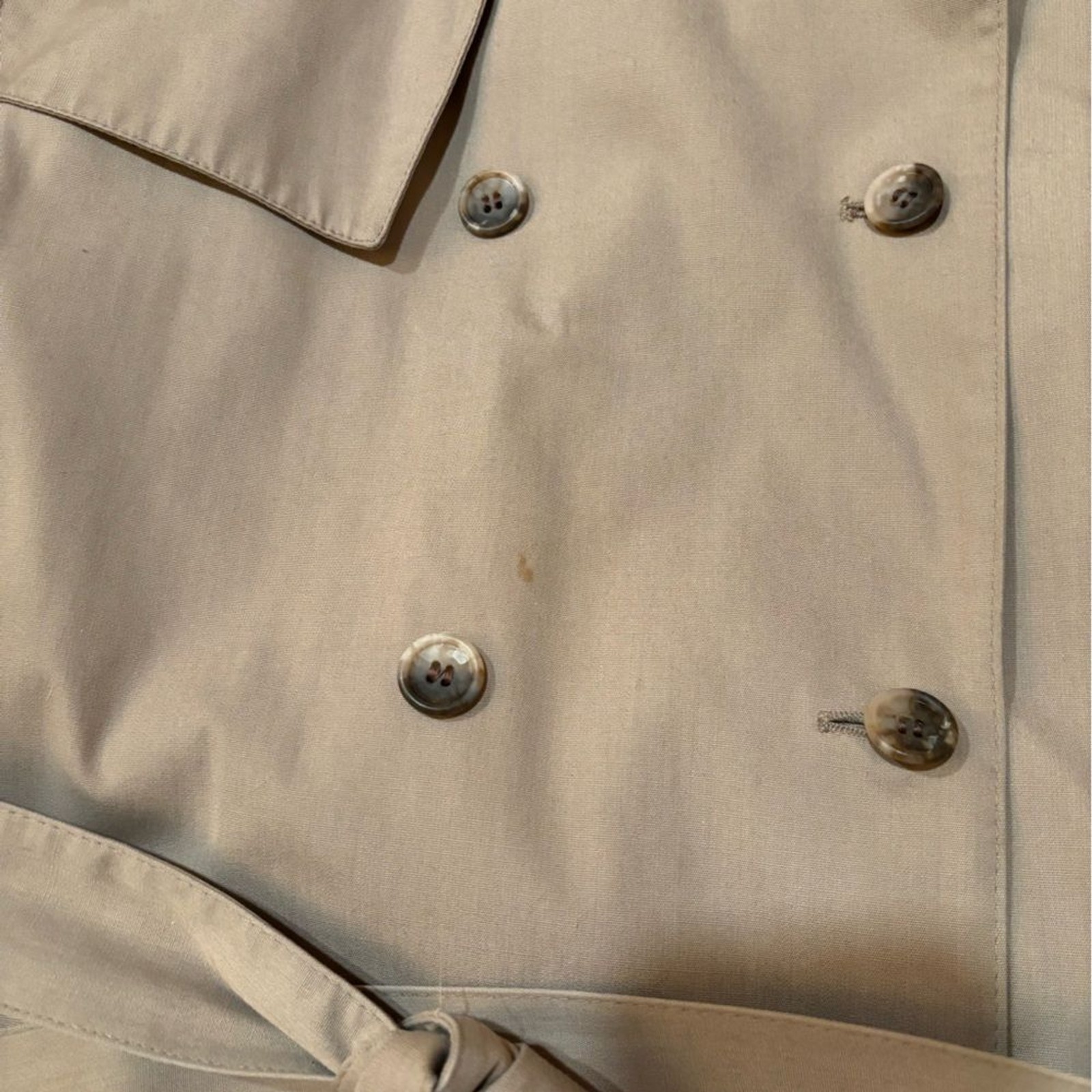 Stylish double-breasted trench coat. Features a classic belt and button details. Ideal for versatile wear. Size 14 petite Has belt Has a few small spots they have not been treated so they might come out! They are hardly noticeable