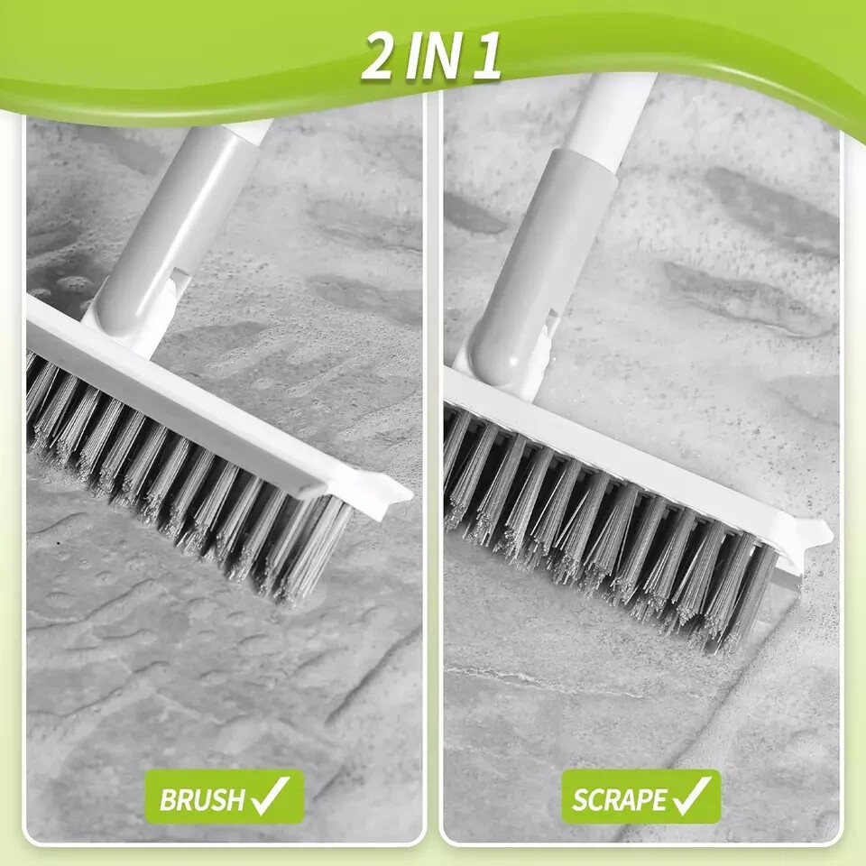 About this item "V" SHAPE STIFF BRISTLES: V-shaped bristles are suitable for stains on the grout, corners, gaps, baseboard, door and window rails 2 IN 1 BRUSH AND SCRAPE: Served as brush and scraper, after brushing the floor, you can easily scrap the sewage 55” LONG HANDLE: This grout brush handle is made of sturdy stainless steel, it is not easy to bend or break in usin。Stop getting down on your hands and knees to clean 180° SWIVEL BRUSH HEAD: Grout brush with 180° ratable head that makes easily scrub away grime or dust from different angle or hard to reach area with ease EASY STORAGE: The grout cleaner brush comes with 4-section sturdy handle. You can easily store the scrubber in any closet. It also features a suspensible hole for easy hanging