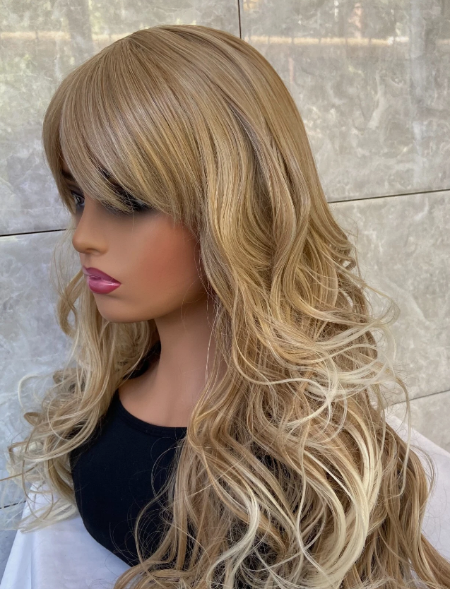 Long Wavy Blonde Lights Mix Synthetic Hair Wigs With Bangs Women Soft Natural