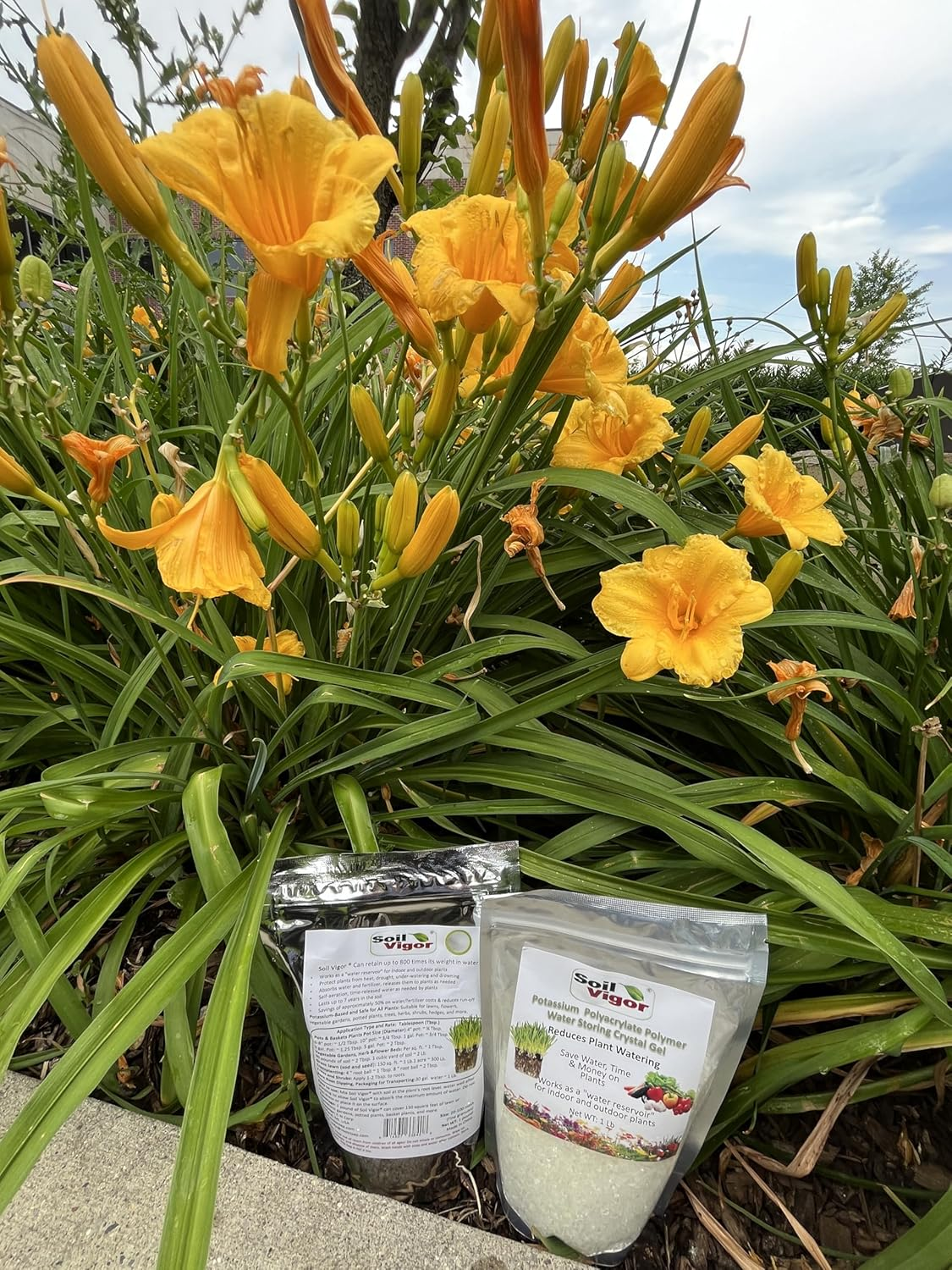 Soil Vigor Potassium Polyacrylate can store up to 600 times its weight in water. It works as a "water reservoir" for indoor and outdoor plants. Protect plants from heat, drought, under-watering & drowning. It absorbs water & fertilizer and releases it to plants as needed. Aeration – self-time-release water created space in the soil. Savings 50% on water/fertilizer cost, reduces run-off. Coverage: 1 pound of Soil Vigor covers 150 sq. ft. for lawn and plants or half a cubic yard of garden soil. Product Description Soil Vigor Potassium Polyacrylate: The Ultimate Soil Amendment What is Soil Vigor? A potassium-based superabsorbent polymer (SAP) Stores up to 800 times its weight in water Enhances soil water-holding capacity without causing clumping Retains soil moisture and prevents nutrient runoff Creates an ideal environment for plant growth Benefits of Using Soil Vigor in Plants Works as a "water reservoir" for indoor and outdoor plants Soil Vigor is a vital 'water reservoir' for indoor and outdoor plants . It significantly boosts the soil's water-holding ability, ensuring consistent hydration. This makes it ideal for houseplants, gardens, and agricultural applications. Protection Against Environmental Stress With its exceptional water-absorbing properties , Soil Vigor shields plants from heat, drought, under-watering, and overwatering. It ensures steady nutrient uptake, conserves water and offers versatile protection in various planting environments. Self-Aeration and Controlled Water Release During its water absorption and release cycle, Soil Vigor creates space in the soil , fostering self-aeration and promoting thriving plant growth. This process ensures plants receive water as needed, reducing the risk of overwatering or under-watering. Efficient Nutrient Absorption By maintaining consistent soil moisture, Soil Vigor supports plant roots' proper absorption of essential nutrients. This improves plant health and vitality, ensuring robust growth and yield. Versatile Protection for Various Planting Environments Soil Vigor is adaptable to diverse planting environments, including indoor potted plants, outdoor gardens, and large-scale landscaping. Its versatility makes it a valuable addition to any gardening toolkit. Save Water, Time, and Money: Reduce Plant Watering by 50% Long-Lasting and Reusable Long-Lasting Solution: Soil Vigor is a potassium polyacrylate polymer that lasts up to 7 years in the soil, providing a long-term water management solution. Water-Saving Benefits: Reduces plant watering by up to 50%. Saves water and time, promoting sustainable gardening practices. Premium Quality: Offers professional-grade results for lush, healthy gardens and lawns. An essential tool for achieving optimal plant growth and vitality. Mastering Soil Vigor: Coverage, Granule Options, and a Safe, Non-Toxic Solution for Thriving Plants and Gardens Coverage: How Much Soil Vigor You Need for Your Project Discover the ideal amount of Soil Vigor required for different projects, from small potted plants to expansive landscapes. Achieve maximum efficiency and ensure your plants thrive with precise coverage recommendations. See the image for details. Granule Sizes: Tailored Options for Every Gardening Need Soil Vigor is available in both large and fine granules. Once hydrated, large granules resemble big jelly chunks, while fine granules look like smooth gel. Both types improve soil structure, enhance water retention, and promote lush plant growth, making them perfect for professional and home use. The fine granules are especially suited for creating smooth surfaces like golf course lawns. Versatile and Safe Potassium-Based Polymer for All Plants and Gardens This potassium-based polymer is suitable for all types of plants, including lawns, flowers, vegetable gardens, potted plants, trees, herbs, shrubs, and hedges. Its safety and efficacy make it a preferred choice for gardeners and agricultural professionals. Soil Vigor Application Guide: One Guide for Both Small and Large Granules 1. Determine Application Amount: Refer to package instructions for accurate dosage. 2. Mix into the Root Zone: · Gardens: Mix 4-6 inches deep into the soil around plant roots. · Container Plants: Blend into the soil while filling containers, leaving a 3-inch gap at the top for polymer expansion. · Lawns & Agriculture: Evenly apply on the surface, then till or plow 4-6 inches deep. · Shrubs & Trees: Mix 6-8 inches deep into the soil around the root zone. · Tree Root Dipping: Hydrate the polymer into a gel-like consistency and dip the roots before planting or wrapping them for moisture retention during transport. 3. Water Thoroughly: Activate the polymer by watering, enabling it to expand and retain moisture. 4. Ongoing Care: Soil Vigor lasts up to 7 years, maintaining optimal moisture levels. Regularly monitor soil moisture and adjust irrigation as needed. Note: Do not top-dress or place the polymer on the surface, as it becomes extremely slippery when hydrated Versatile Sizing and Bulk Packaging: Solutions for Every Gardening Project 1 lb Bag: Compact Solution for Small-Scale Gardening Needs It is perfect for indoor and outdoor plants, potted flowers, or small garden beds, and you can choose between large or small granules. This makes it a convenient and versatile solution for beginners and hobbyists seeking improved soil water retention and plant hydration. 5 lb Bag: Ideal for Medium-Sized Gardens and Planters The 5-lb bag of Soil Vigor is designed for outdoor planters, garden beds, and medium-sized landscaping projects. It provides a balanced mix of large and small granules, optimizing soil structure, boosting water absorption, and ensuring steady nutrient uptake for thriving plants. 20 lb Bag: Professional-Grade Bulk Solution for Large-Scale Projects Tailored for expansive gardens, agriculture, or professional landscaping, the 20 lb bag offers maximum efficiency and value. It enhances soil flexibility, improves water-hol