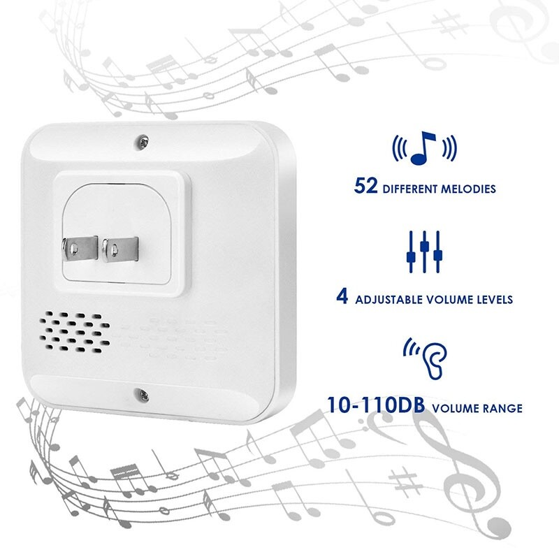 Wireless Doorbell, Doorbell Kit Operating at 1000 Feet with 52 Melodies, 4 Volume Levels, LED Flash, 1 Waterproof Touch Sensor and 1 Receiver for Home/Office/Warehouse/Hotel(TS-T Series White) Product description Specification: Receiver Working:Voltage AC 90-250V Receiver Power Consumption ≤0.5W,Input:10mW Wireless range:500-1000 feet (in the oper air) Modulation mode of transmitter:ASK/OOK Sensitivity of Receiver:-110dbm Battery of Transmitter:12V/23A alkaline battery Receiver Volume:10-110db Transmitter power:0dbm Working Frequency:433.92MHZ±200KHZ Package Includes 2 x Push Button (Transmitter) 2 x mounting Screws 1 x Double-Sided Adhesive Tape 1 x Instruction Manual
