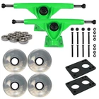 Longboard 181mm Reverse Kingpin Green Trucks 70mm Clear Wheels with Bearings & Hardware Description Longboard 181mm Reverse Kingpin Green Trucks 70mm Clear Wheels with Bearings & Hardware JUST ADD WOOD - This just add wood package contains everything you need to complete or upgrade a deck. Includes Trucks, Wheels, Bearings, Hardware, and Risers. Just add wood! HEAVY DUTY TRUCKS - These Downhill trucks are 181mm and feature a strong and lightweight aluminum alloy from hanger to baseplate. Having an angle of 50 degree, these trucks give you the right amount of turn paired with stability. They come stock with cast polyurethane bushings. HIGH REBOUND WHEELS - The wheels measure 70mm. These wheels offer the perfect cruise around the city wheel. The softness of these wheels offers for a smooth ride and absorbs vibration without wearing out to quickly. HARDWARE - Includes 1.5” black Phillips bolts. The hardware is made of high-grade steel. Includes a set of 2, 1/4" polyurethane riser pads. These risers feature the 6-hole design so these will fit on virtually all deck and truck combinations. BEARINGS - Comes with ABEC7 bearings. The balls run in deep-grove race ways, and are retained by a self-lubricating Delrin crown. A low viscosity synthetic oil has been added to make these bearings spin great, while keeping friction levels at a minimum. Shipping Orders placed before cut-off time ship same day! Return Policy If you are unhappy with your order for any reason, you can return your items for a refund or exchange. Please review the details on the shipping and payments tab. Hooking Up Skaters Since 2004 About Us Other Listings Give Us a Feedback Powered by Solid Commerce The All-in-One Listing, Inventory & Order Management Solution for Online Merchants