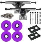 Longboard 181mm Reverse Kingpin Silver Trucks 76mm Purple Wheels with Bearings & Hardware Description Longboard 181mm Reverse Kingpin Silver Trucks 76mm Purple Wheels with Bearings & Hardware JUST ADD WOOD - This just add wood package contains everything you need to complete or upgrade a deck. Includes Trucks, Wheels, Bearings, Hardware, and Risers. Just add wood! HEAVY DUTY TRUCKS - These Downhill trucks are 181mm and feature a strong and lightweight aluminum alloy from hanger to baseplate. Having an angle of 50 degree, these trucks give you the right amount of turn paired with stability. They come stock with cast polyurethane bushings. HIGH REBOUND WHEELS - The wheels measure 76mm. These wheels offer the perfect cruise around the city wheel. The softness of these wheels offers for a smooth ride and absorbs vibration without wearing out to quickly. HARDWARE - Includes 1.5” black Phillips bolts. The hardware is made of high-grade steel. Includes a set of 2, 1/4" polyurethane riser pads. These risers feature the 6-hole design so these will fit on virtually all deck and truck combinations. BEARINGS - Comes with ABEC7 bearings. The balls run in deep-grove race ways, and are retained by a self-lubricating Delrin crown. A low viscosity synthetic oil has been added to make these bearings spin great, while keeping friction levels at a minimum. Shipping Orders placed before cut-off time ship same day! Return Policy If you are unhappy with your order for any reason, you can return your items for a refund or exchange. Please review the details on the shipping and payments tab. Hooking Up Skaters Since 2004 About Us Other Listings Give Us a Feedback Powered by Solid Commerce The All-in-One Listing, Inventory & Order Management Solution for Online Merchants