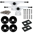 Longboard 181mm Reverse Kingpin White Trucks 76mm Black Wheels with Bearings & Hardware Description Longboard 181mm Reverse Kingpin White Trucks 76mm Black Wheels with Bearings & Hardware JUST ADD WOOD - This just add wood package contains everything you need to complete or upgrade a deck. Includes Trucks, Wheels, Bearings, Hardware, and Risers. Just add wood! HEAVY DUTY TRUCKS - These Downhill trucks are 181mm and feature a strong and lightweight aluminum alloy from hanger to baseplate. Having an angle of 50 degree, these trucks give you the right amount of turn paired with stability. They come stock with cast polyurethane bushings. HIGH REBOUND WHEELS - The wheels measure 76mm. These wheels offer the perfect cruise around the city wheel. The softness of these wheels offers for a smooth ride and absorbs vibration without wearing out to quickly. HARDWARE - Includes 1.5” black Phillips bolts. The hardware is made of high-grade steel. Includes a set of 2, 1/4" polyurethane riser pads. These risers feature the 6-hole design so these will fit on virtually all deck and truck combinations. BEARINGS - Comes with ABEC7 bearings. The balls run in deep-grove race ways, and are retained by a self-lubricating Delrin crown. A low viscosity synthetic oil has been added to make these bearings spin great, while keeping friction levels at a minimum. Shipping Orders placed before cut-off time ship same day! Return Policy If you are unhappy with your order for any reason, you can return your items for a refund or exchange. Please review the details on the shipping and payments tab. Hooking Up Skaters Since 2004 About Us Other Listings Give Us a Feedback Powered by Solid Commerce The All-in-One Listing, Inventory & Order Management Solution for Online Merchants