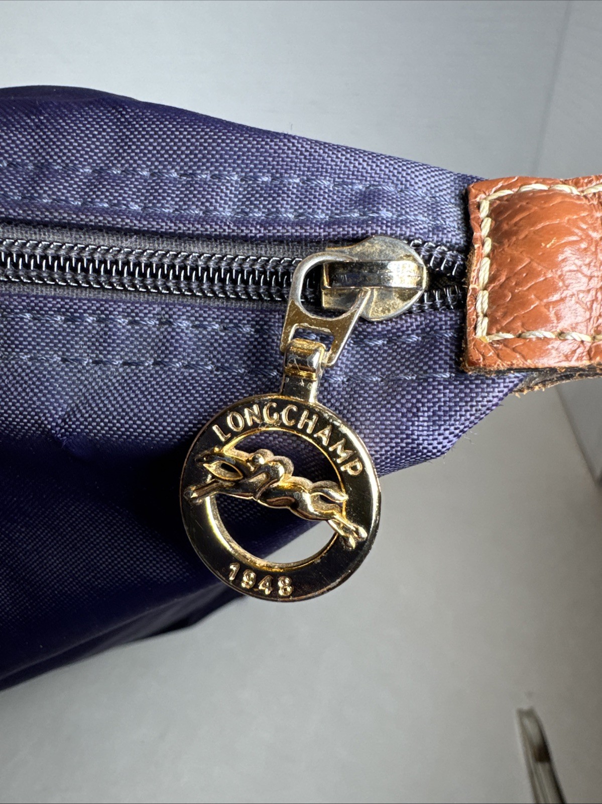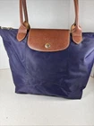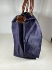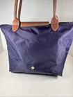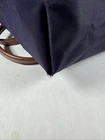 The Longchamp Le Pliage Bag is a stylish and versatile tote designed for women on-the-go. This small rectangle-shaped bag features a zip closure, brown leather double handles, and gold-plated hardware for a touch of luxury. Made from durable nylon with leather accents, this lightweight and foldable bag is perfect for travel and casual outings, adding a classic designer flair to your outfit. Its solid purple exterior color and vintage appeal make it a chic and timeless accessory for any city chic look. Made in France by Longchamp, this Le Pliage “Shopping” modele depose bag combines practicality with a touch of sophistication.