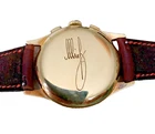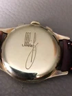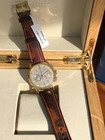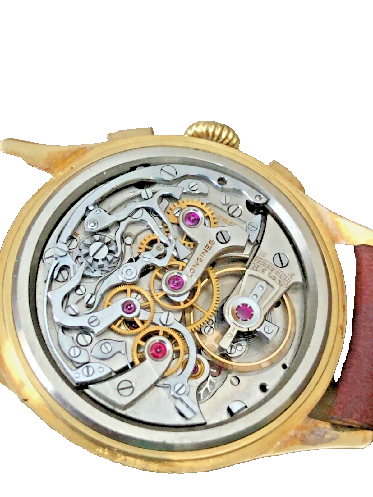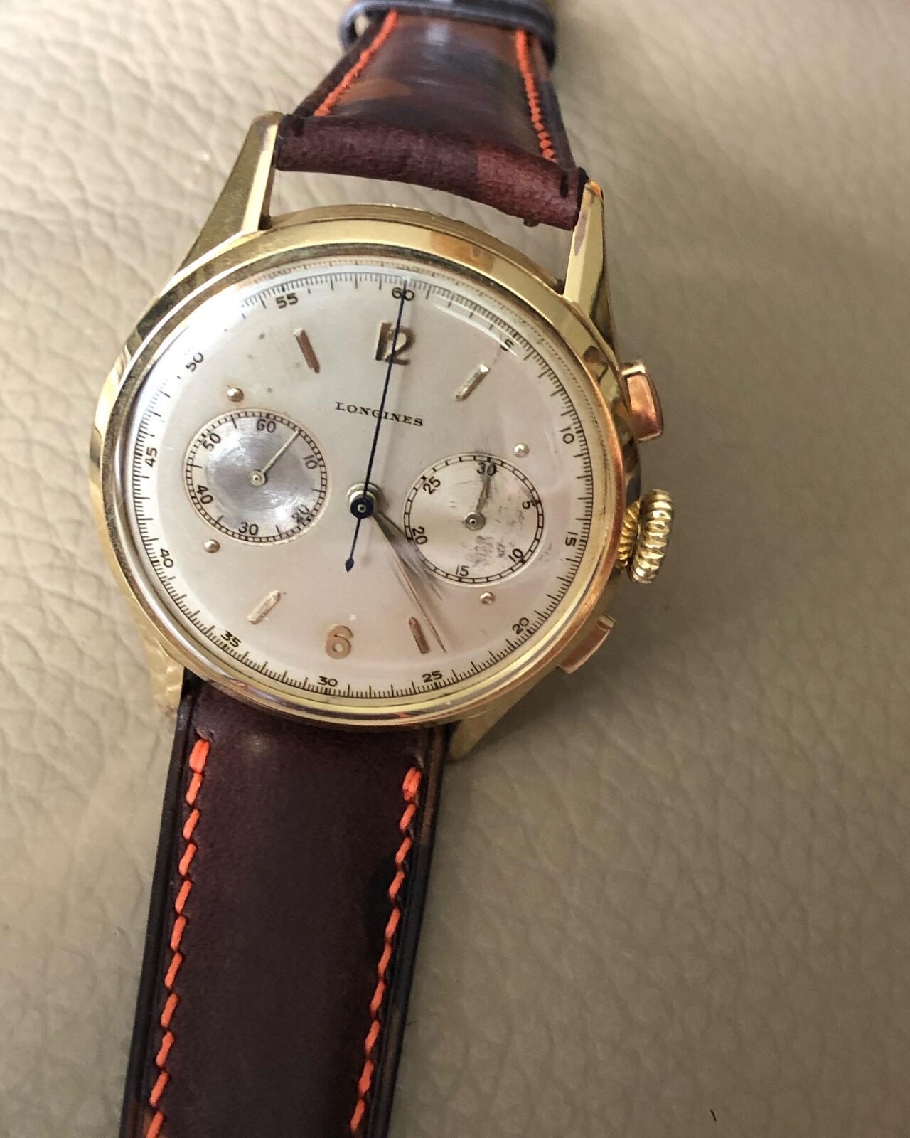 Longines 13ZN12 flyback chronograph watch is the quintessential swiss manfacture watch that introduced the first wrist watch with flyback function with 2 bush buttons. Based in St. Imier the Longines brand is the front runner in the in-house manufacture and innovation of flyback chrongraph watches in Swiss Horology. This piece is in with 2 square pusher buttons that was made in 1948 in 18ct gold 38mm case with silver color dial with goldplated baton index hour marks and 12 & 6 in arab numerals, the very few FLYBACK wrist watches in the 13zn models with 2 push square buttons, hence very rare piece. Attached to the watch is a bespoke Brown Camo top & suede brown back strap curved with easy change pin and a original period buckle. Watch comes with record from the archives from Longines switzerland for this watch for exact record of its production/sale showing that the serial No: 7,32xxxx was invoiced on 24th May 1948 to the company Girod, agent of the brand in Spain. Most iconic swiss watch of 1940’s to 1970 when the brand was the most prestigious manufacturer of chronographs watches and its movements fully inhouse in its factory in St.Imier, Switzerland. Note: Light scratches on case and engraved insignia on case back (see pic) patina and scratches on dial (see pic)