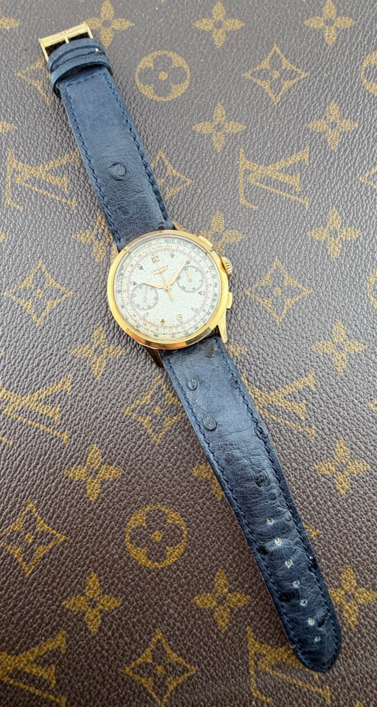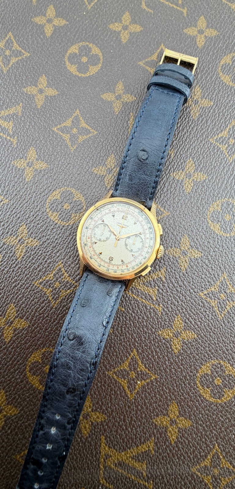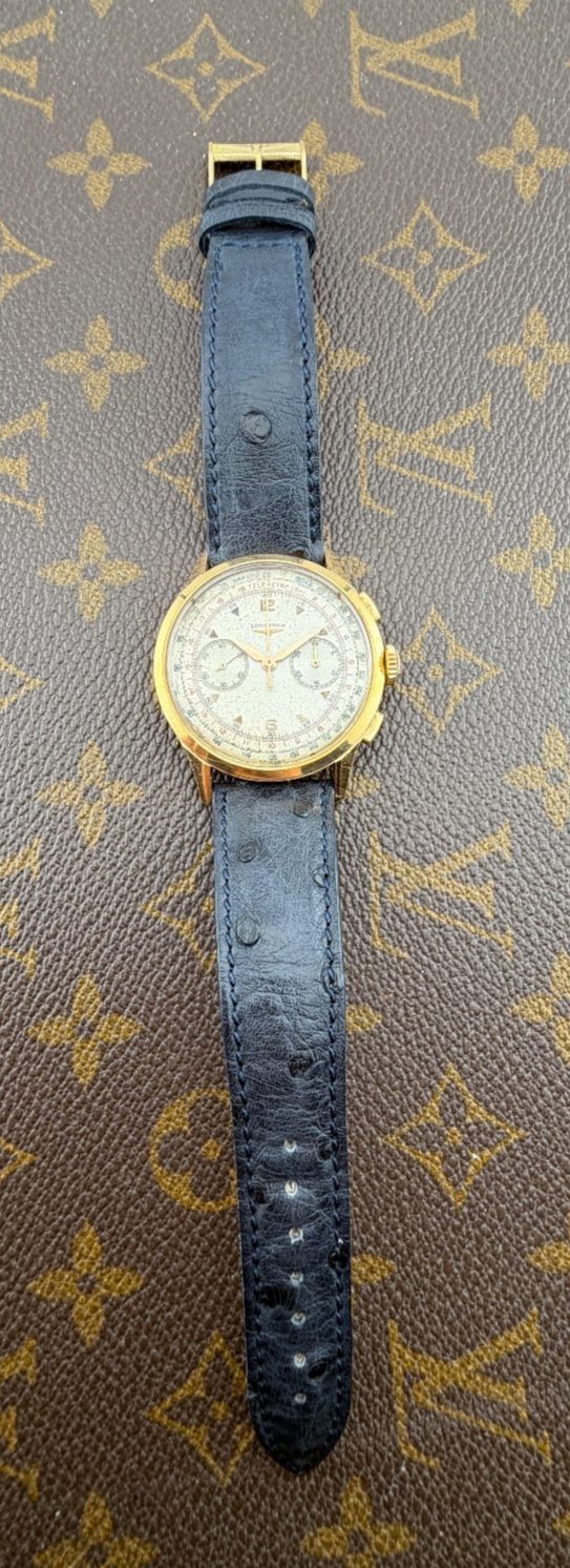 PROPONIAMO; -Marca: LONGINES CRONOGRAFO -Cassa: ORO ROSA DA 38MM ESCLUSA CORONA , FONDELLO ORIGINALE A SCATTO CASSA MAI LUCIDATA -Movimento :ORIGINALE CALIBRO 30CH , COEVO IN TUTTE LE SUE PARTI -Vetro:PLEXY -Corona:ORIGINALE -Ghiera: LISCIA -Tasti: ORIGINALI IN ORO -Quadrante: ORIGINALE , CON STUPENDA PATINA DEL TEMPO -Lancette: ORIGINALI -Cinturino/Bracciale:PELLE STRUZZO DA 20MM , FIBBIA ORIGINALE DA 16MM PLACCATA ORO -Scatola e documenti: NOSTRA POCHETTE IN VELLUTO COMPRESA + ESTRATTO D'ARCHIVIO ORIGINALE -Condizioni :OTTIME -Revisionato:SI -Uomo/donna/unisex:UOMO PER QUALSIASI DUBBIO CONTATTATEMI ,RISPONDEREMO IL PRIMA POSSIBILE