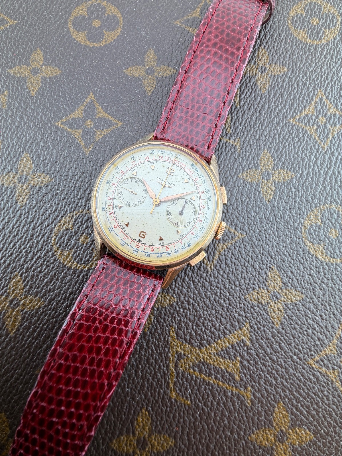 PROPONIAMO; -Marca: LONGINES CRONOGRAFO -Cassa: ORO GIALLO DA 38MM , FONDELLO ORIGINALE A PRESSIONE -Movimento :ORIGINALE LONGINES CALIBRO 30CH A CARICA MANUALE , COEOVO IN TUTTE LE SUE PARTI -Vetro:PLEXY -Corona:GENERICA -Ghiera: ORO ROSA -Tasti: ORIGINALI -Quadrante: ORIGINALE STUPENDO CON LEGGERA PATINA DEL TEMPO , INCIDI APPLICATI IN ORO ROSA -Lancette: ORIGINALI -Cinturino/Bracciale: LUCERTOLA BORDEAUC DA 20MM , FIBBIA ORIGINALE DA 16MM -Scatola e documenti: NOSTRA POCHETTE IN VELLUTO COMPRESA -Condizioni :FANTASTICHE -Revisionato:SI -Uomo/donna/unisex:UOMO PER QUALSIASI DUBBIO CONTATTATEMI ,RISPONDEREMO IL PRIMA POSSIBILE