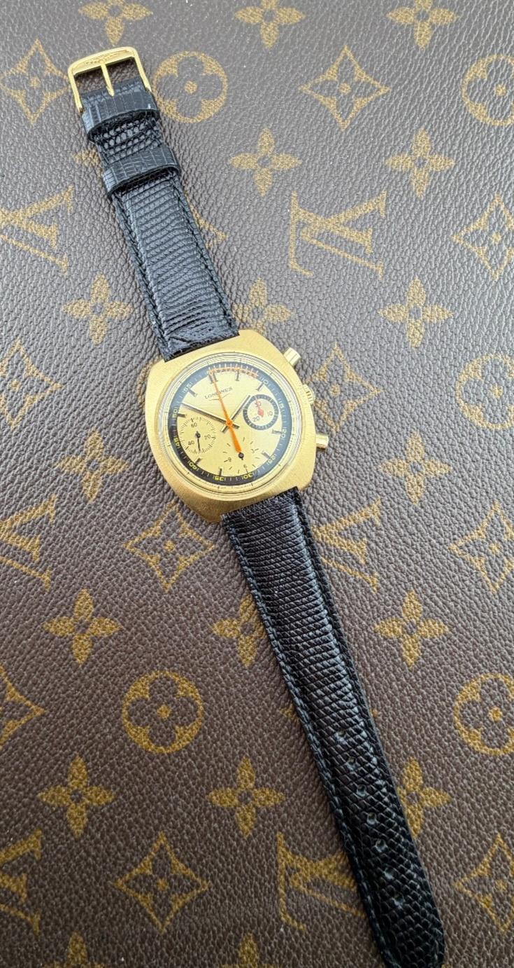 PROPONIAMO; -Marca: LONGINES CHRONOGRAPHE -Cassa: ORO GIALLO DA 18KT , 38,5MM , FONDELLO ORIGINALE A VITE -Movimento :ORIGINALE CALIBRO VALJOUX 72 , COEVO -Vetro:PLEXY -Corona:ORIGINALE -Ghiera: INTERNA -Tasti: ORIGINALI A POMPA -Quadrante: ORO , ORIGINALE -Lancette: ORIGINALI , SFERA CENTRALE CON FUNZIONE DECIMO DI SECONDO -Cinturino/Bracciale: NERO LUCERTOLA 20MM , FIBBIA 16 MM ORIGINALE -Scatola e documenti: NOSTRA POCHETTE IN VELLUTO COMPRESA -Condizioni : OTTIME -Revisionato:SI -Uomo/donna/unisex:UOMO PER QUALSIASI DUBBIO CONTATTATEMI ,RISPONDEREMO IL PRIMA POSSIBILE