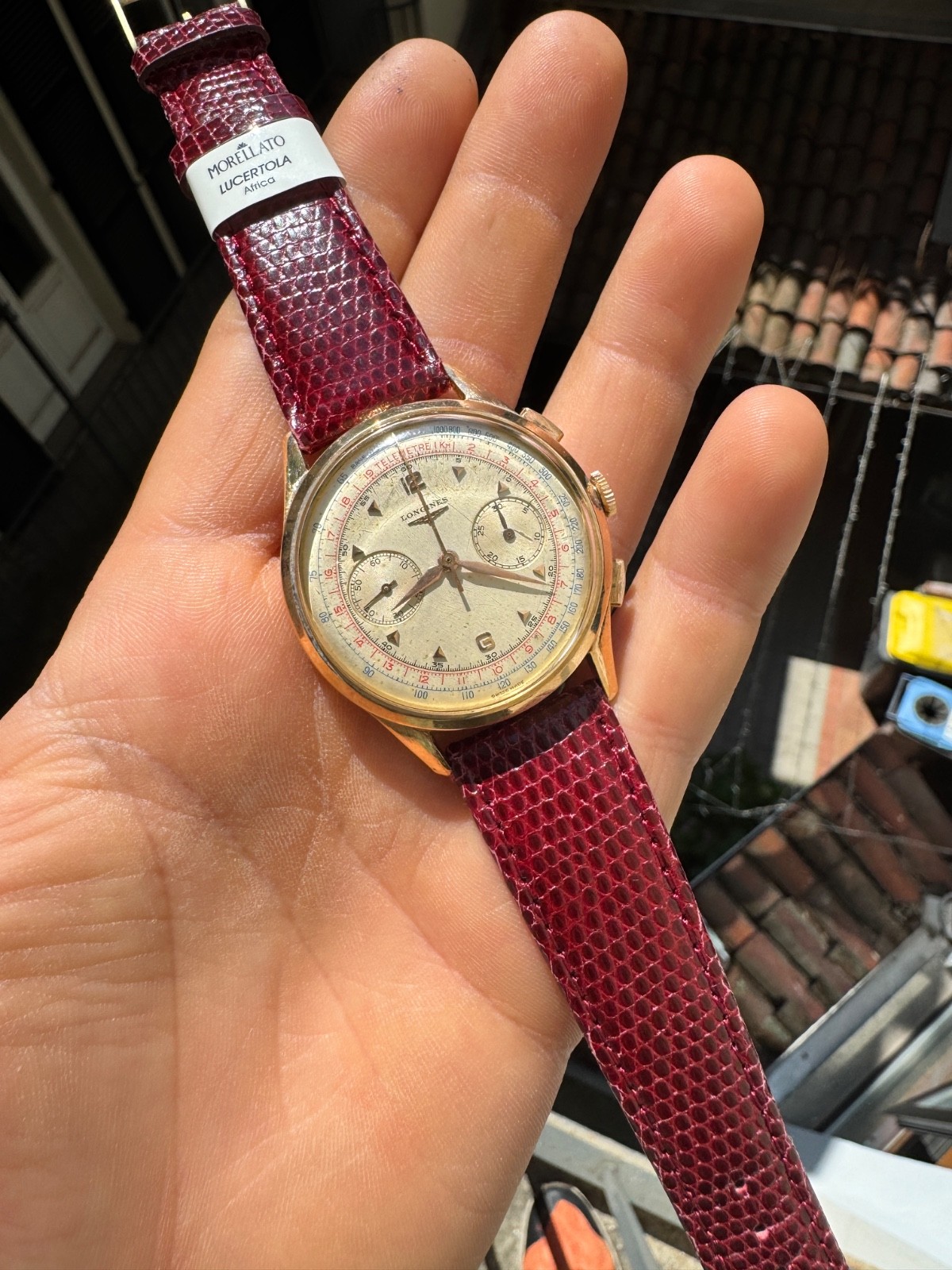 PROPONIAMO; -Marca: LONGINES CRONOGRAFO -Cassa: ORO GIALLO DA 38MM , FONDELLO ORIGINALE A PRESSIONE -Movimento :ORIGINALE LONGINES CALIBRO 30CH A CARICA MANUALE , COEOVO IN TUTTE LE SUE PARTI -Vetro:PLEXY -Corona:GENERICA -Ghiera: ORO ROSA -Tasti: ORIGINALI -Quadrante: ORIGINALE STUPENDO CON LEGGERA PATINA DEL TEMPO , INCIDI APPLICATI IN ORO ROSA -Lancette: ORIGINALI -Cinturino/Bracciale: LUCERTOLA BORDEAUC DA 20MM , FIBBIA ORIGINALE DA 16MM -Scatola e documenti: NOSTRA POCHETTE IN VELLUTO COMPRESA -Condizioni :FANTASTICHE -Revisionato:SI -Uomo/donna/unisex:UOMO PER QUALSIASI DUBBIO CONTATTATEMI ,RISPONDEREMO IL PRIMA POSSIBILE