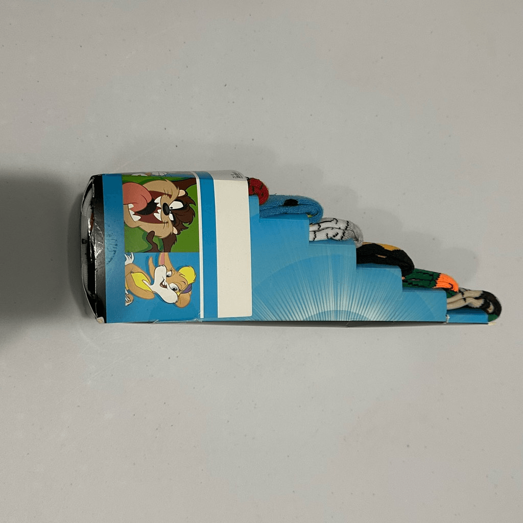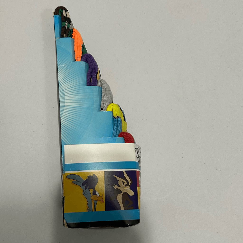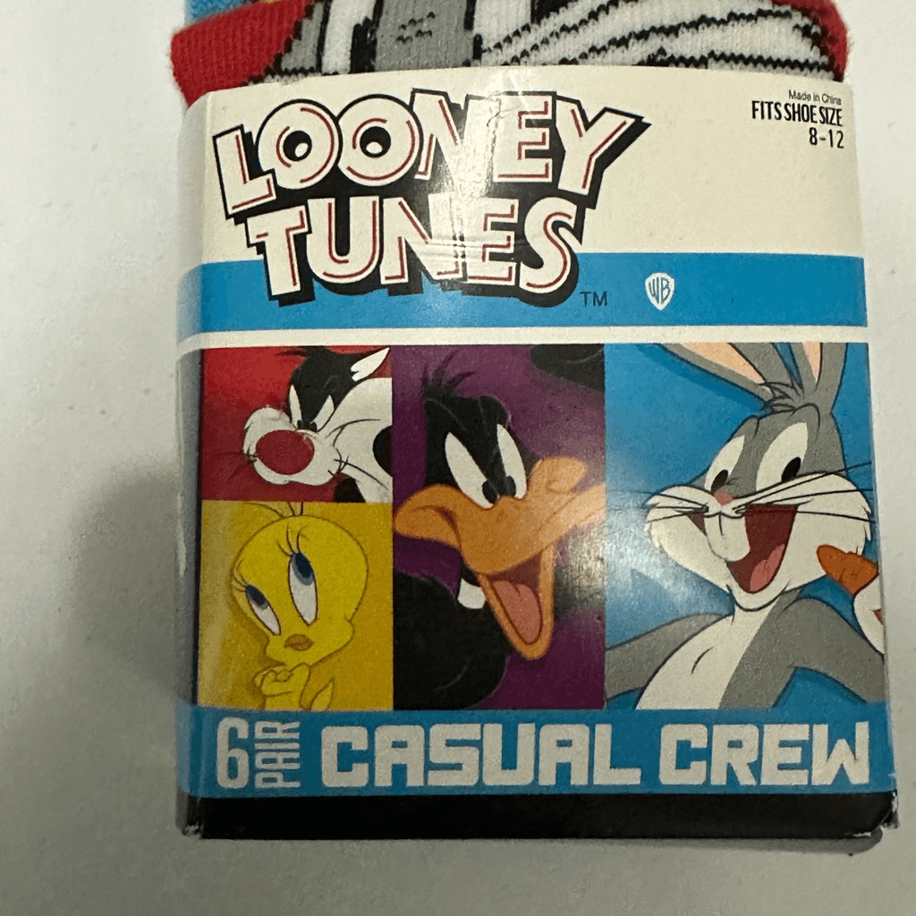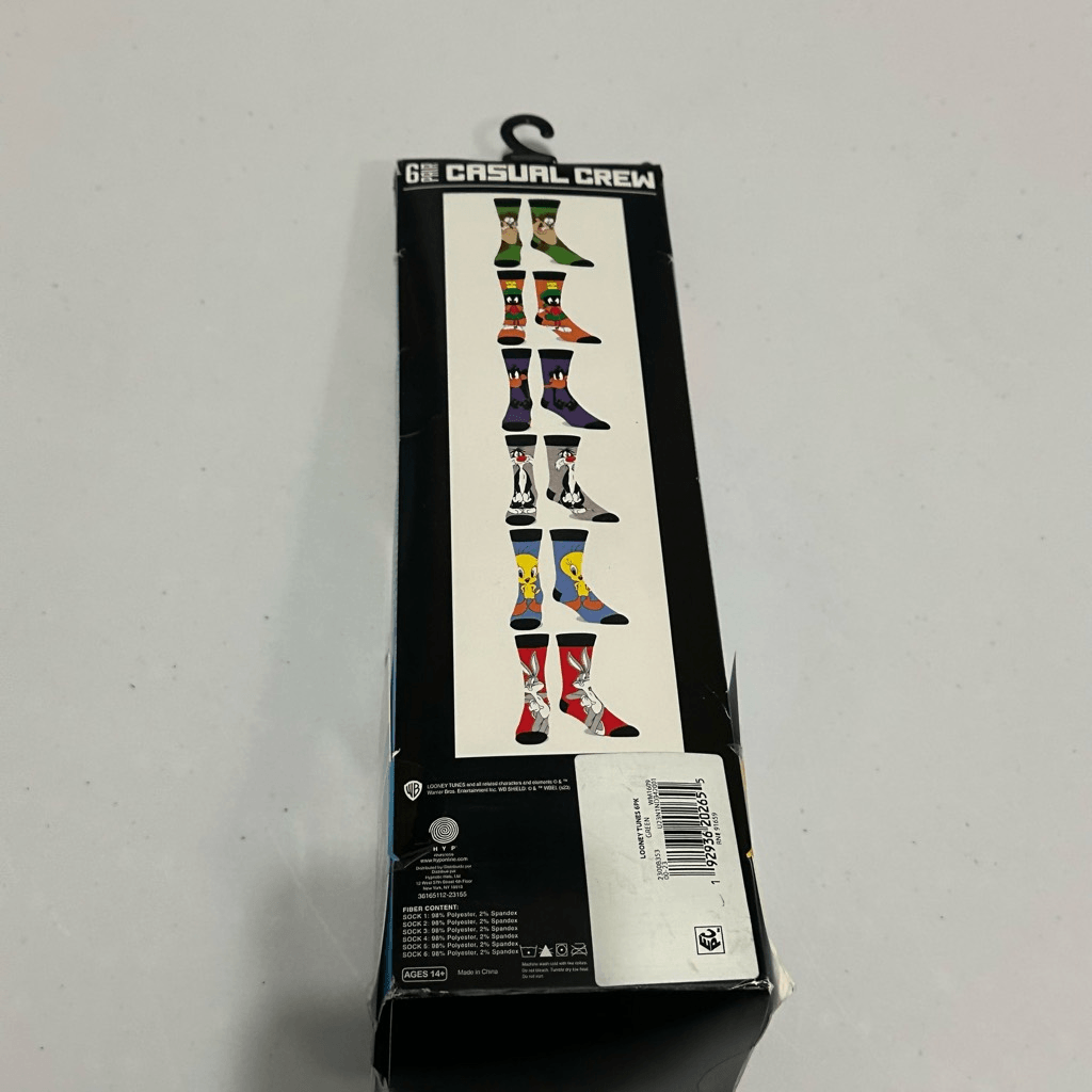 This set includes 6 pair of casual crew socks with Looney Tunes characters on them: Tazmanian Devil, Marvin the Martian, Daffy Duck, Sylvester, Tweety Bird, & Bugs Bunny. Green, Orange, Purple, Gray, Blue, and Red. Machine washable. All socks are made with polyester and spandex. New, Never opened. Still seeled. #1527 Warner Brothers, Looney Tunes, cartoons, cartoon, 90s cartoons
