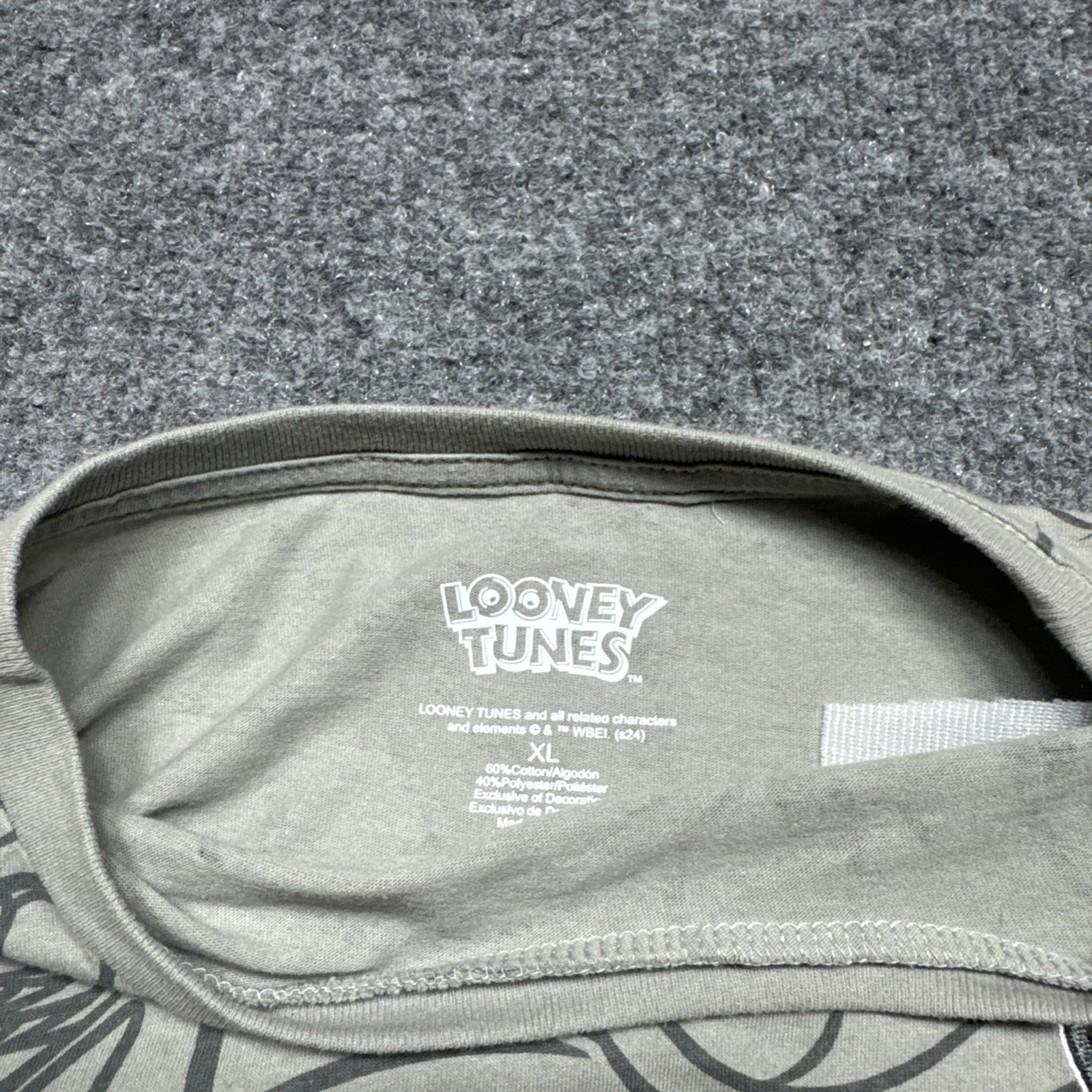 XL gray Looney Tunes Bugs Bunny T-shirt featuring an embroidered Bugs Bunny design. Made of a cotton blend material with a crew neck neckline. The shirt is part of the Looney Tunes brand and has a cartoon theme. It is a regular fit for men and is not vintage. The shirt is from China and is perfect for fans of the Looney Tunes character family.