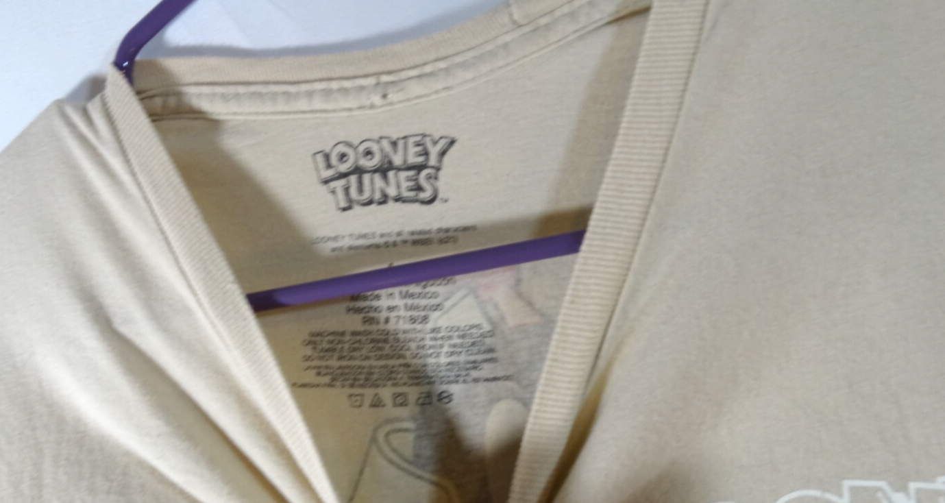 Embrace the nostalgia with this Looney Tunes double-sided cartoon T-shirt, featuring the iconic duo of Bugs Bunny and Daffy Duck. This gray, regular fit tee boasts a classic crew neck and short sleeves, ideal for a casual, retro look. Made from soft, breathable cotton jersey, it's comfortable for all-day wear and easy to care for—simply pop it in the machine wash. Crafted with a graphic print that celebrates the zany world of Looney Tunes, this T-shirt is a must-have for fans and vintage clothing enthusiasts alike. Its unique double-sided design adds an element of fun to your wardrobe, making it a versatile piece that's perfect for any casual outing or collecting. chest 44" length 26"