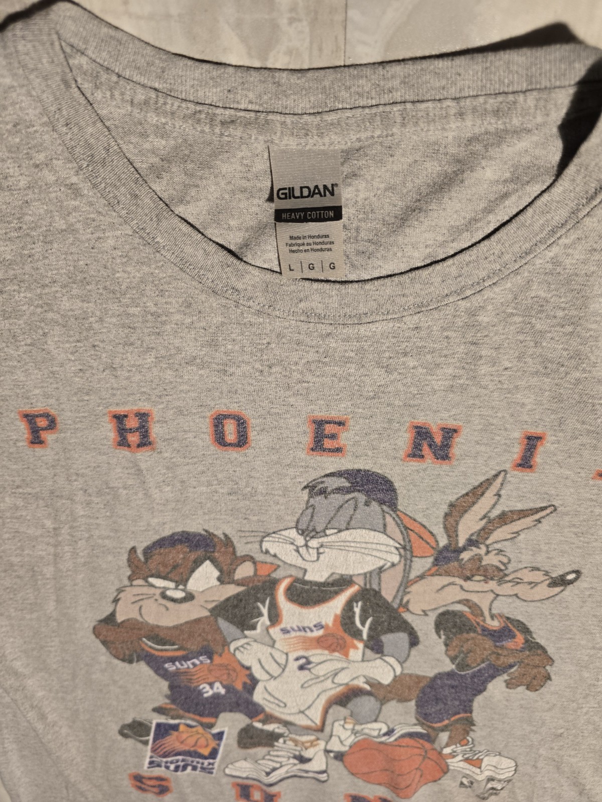 This shirt is awesome! The design is super fun with Taz and Bugs Bunny repping the Suns—perfect for NBA and Looney Tunes fans. The cotton is soft and comfy, and the fit is just right. Love the retro vibe, great for casual wear or game days. Definitely a must-have for any cartoon or basketball lover!