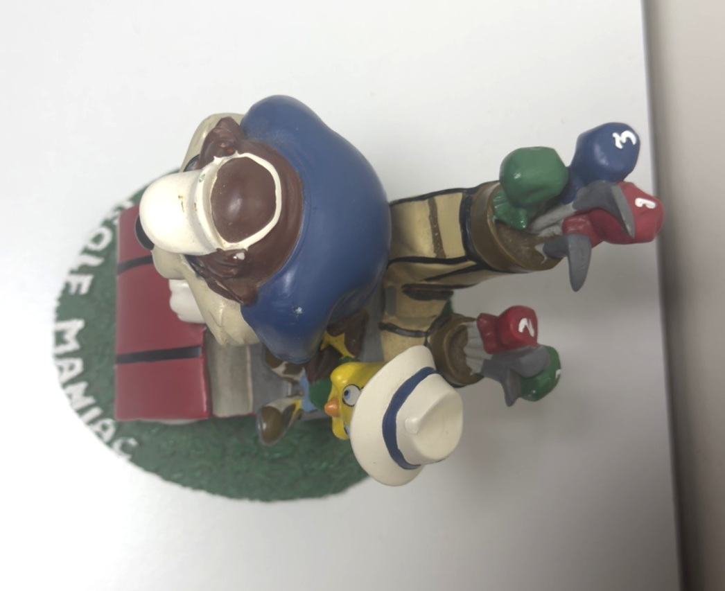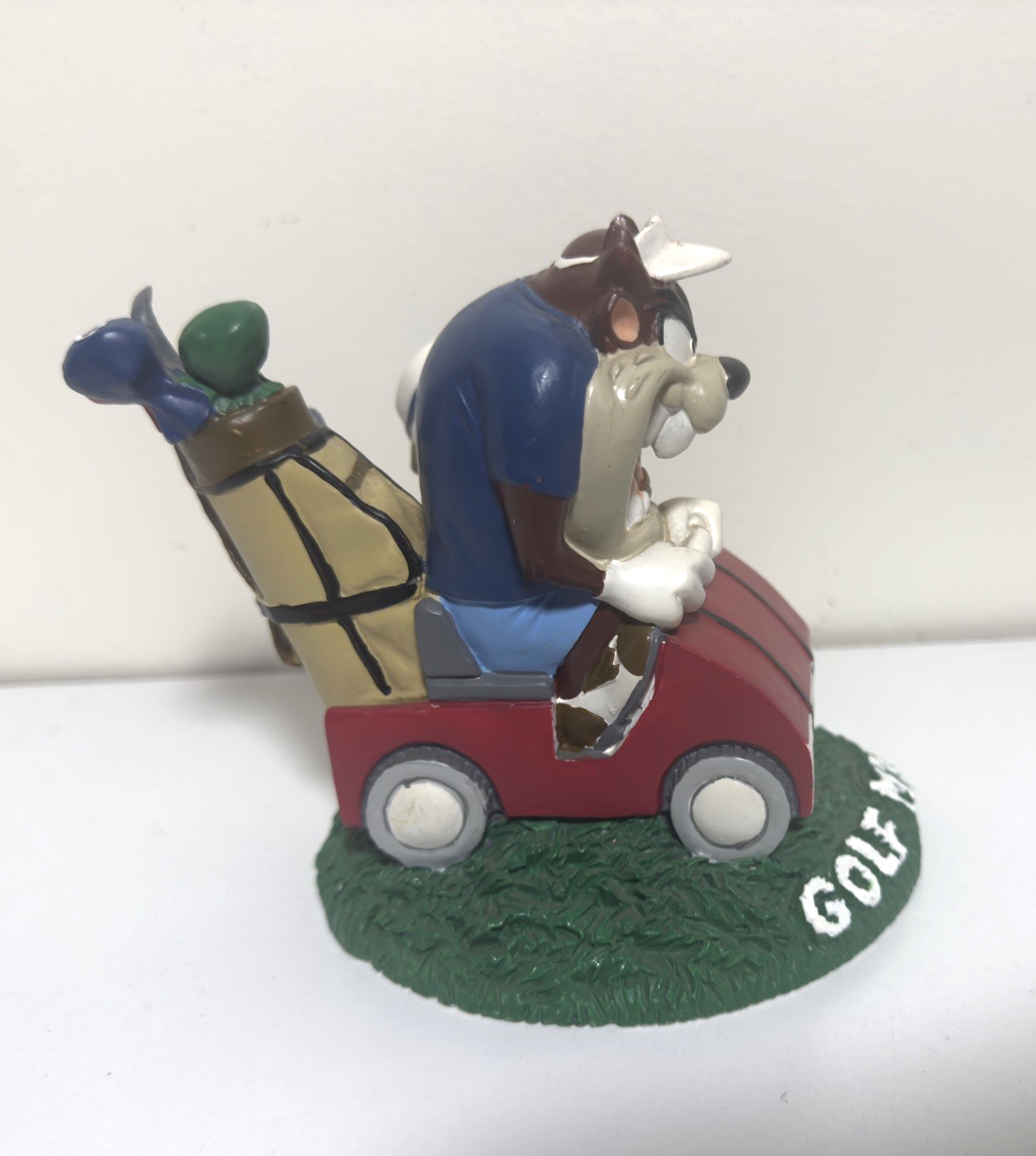 The Looney Tunes Taz Tweety Vintage 1996 Golf Maniac Figurine Statue is a nostalgic collectible featuring characters from the Warner Bros. franchise. This resin statue showcases the iconic Tasmanian Devil and Tweety in an interactive golfing scene, adding a touch of playfulness to any space. Manufactured in 1996 in China, this unique piece is a must-have for fans of classic Looney Tunes. Small paint chip shown in photo.