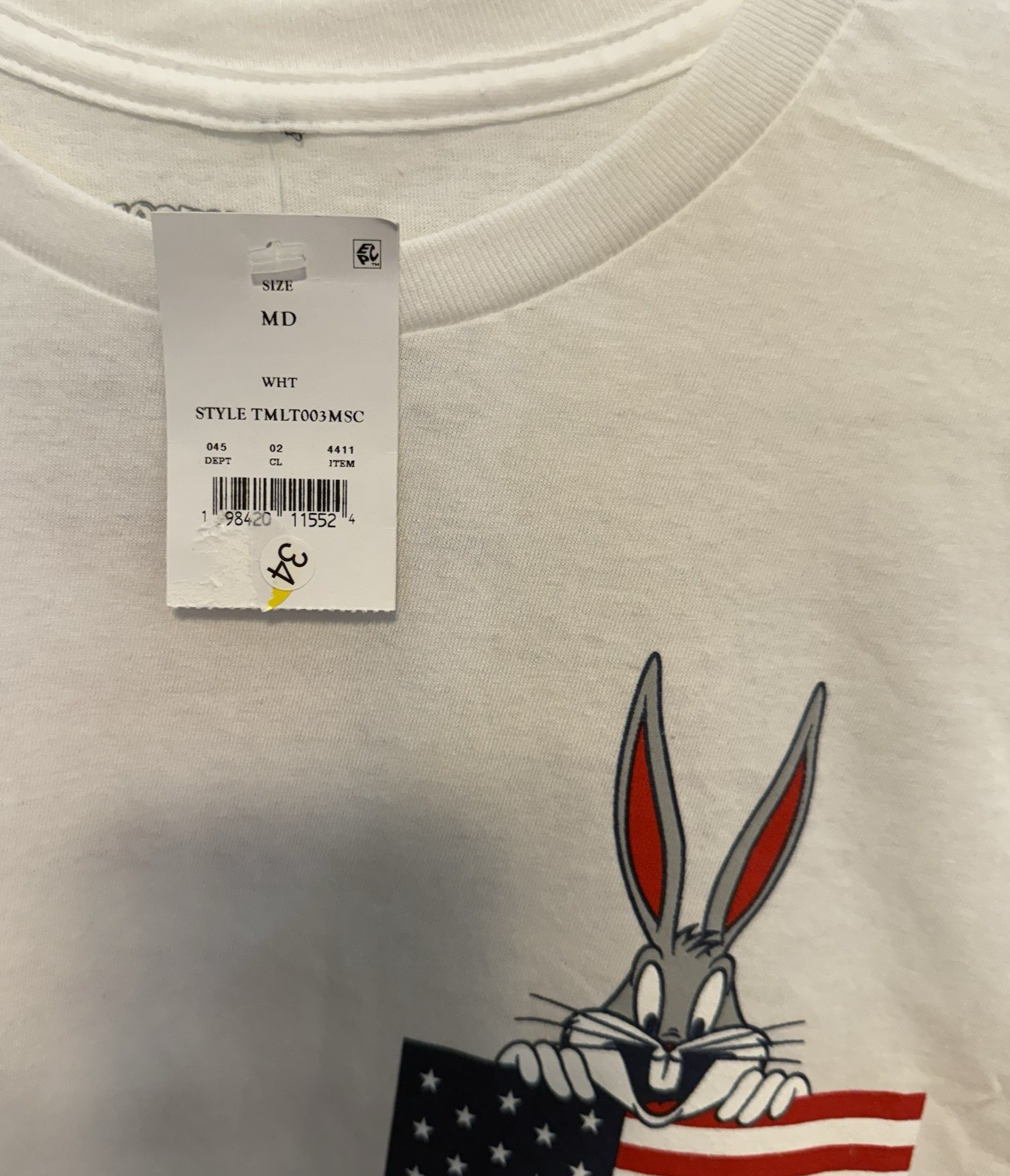 The product is a men's size medium Looney Tunes Team USA win the gold Olympic T-shirt featuring Bugs Bunny. The shirt is white with short sleeves and a regular fit, perfect for fans of the classic cartoon characters and supporters of Team USA. The design combines elements of sports, the USA theme, and the beloved Looney Tunes characters, making it a fun and stylish addition to any wardrobe.