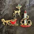 Lor of 3 VTG Christmas Brooches Candle Reindeer Horse & Sleigh Gold Toned Enamel These pieces are in great condition with very minor signs of wear. The approximate measurements are included in the pictures. Please look carefully at the pictures, as they are part of the description. Please contact me with any questions. Thanks so much for looking. 52/1124rfhb