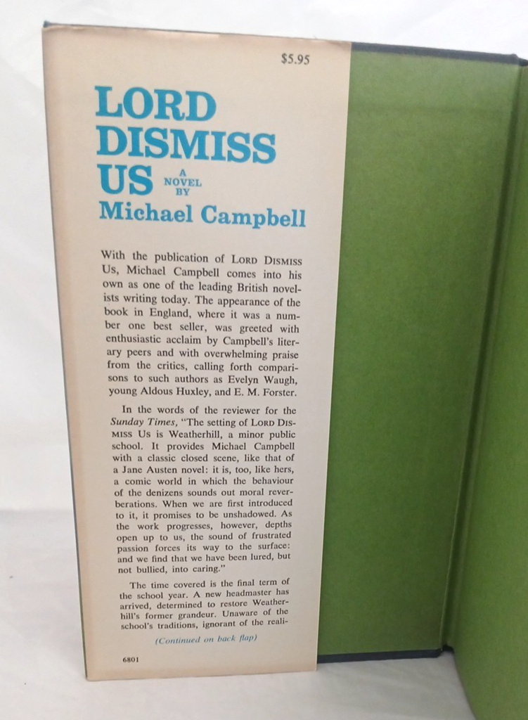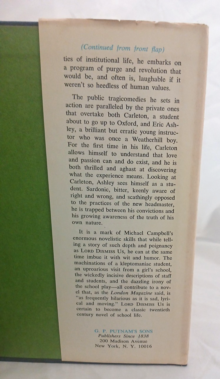 "Lord Dismiss Us" is a vintage first American edition hardcover novel written by Michael Campbell, published by G. P. Putnam's Sons in 1968. This LGBT-themed book, with a dust jacket and 384 pages, is intended for adult readers and explores themes of literature and LGBT studies. Lord Dismiss Us is set in an English boys' public school in the 1960s. The novel deals with the love affair between two boys, together with the internal politics of the school itself.