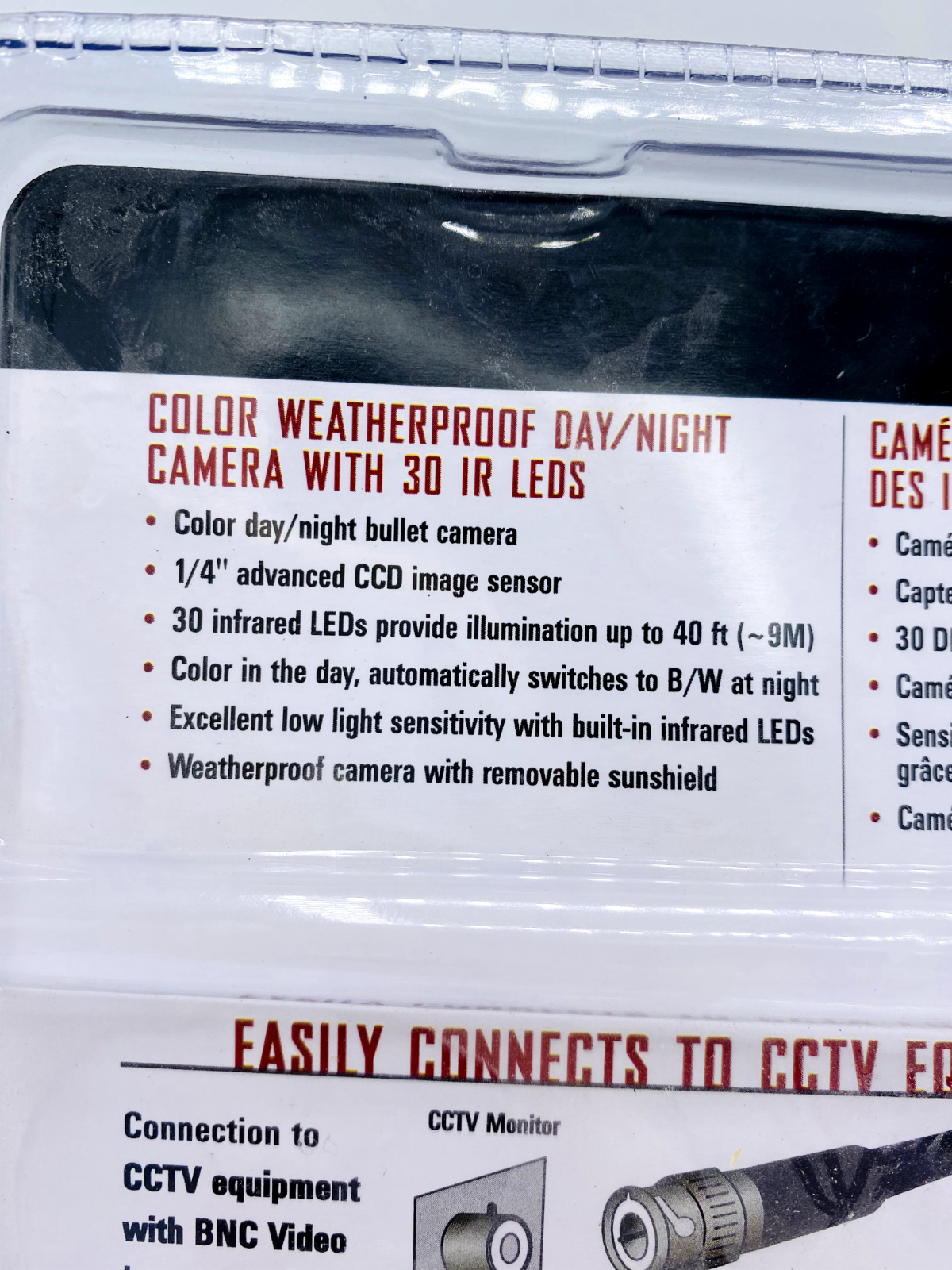 BRAND NEW NEVER OPENED - Films in color during daylight and black and white at night - includes 63 ft. power cable - weatherproof, waterproof, & includes removable sunshield FREE NEXT DAY SHIPPING !!! Please don't hesitate to message with any inquiries! 07