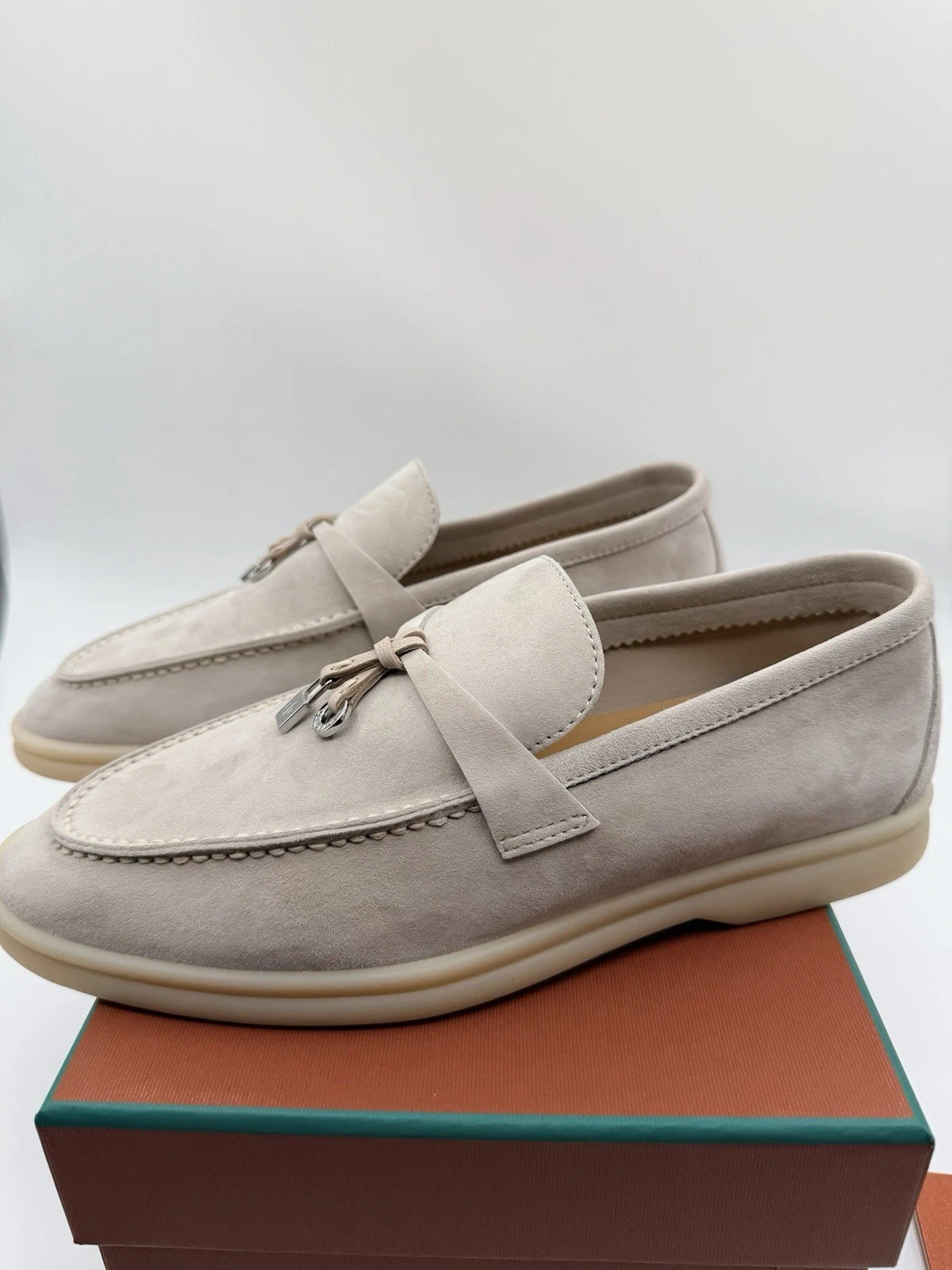 The Loro Piana Summer Charm Walk Women's EU 37 Pearl Grey Loafer Shoes are stylish and comfortable flats perfect for the summer season. Made by the prestigious brand Loro Piana in collaboration with Pearl Grey, these loafers in grey color are designed specifically for women in a US shoe size 6 and EU shoe size 36. The loafer style offers a trendy and versatile option for everyday wear, making them a must-have for any fashion-forward woman's shoe collection.