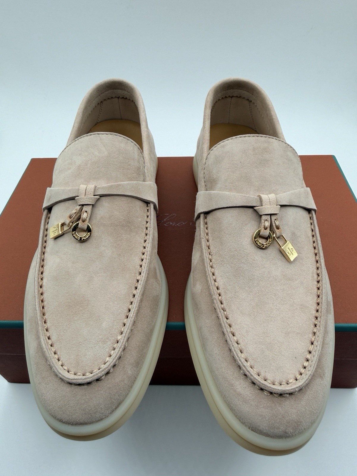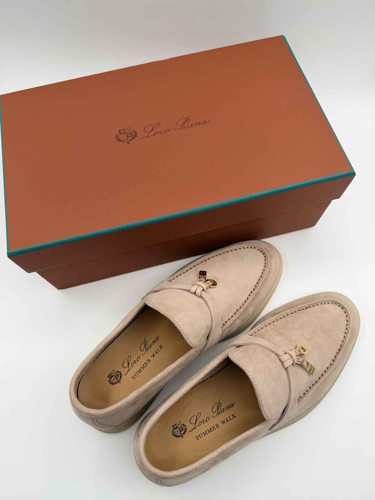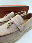 The Loro Piana Summer Charm Walk Women's EU 38 Sandstone Loafer Shoes are a stylish and comfortable option for women during the summer season. These pink loafers, with a US shoe size of 8 and EU 38, are perfect for adding a touch of elegance to any outfit. The flat design and high-quality construction make them a versatile choice for both casual and dressy occasions. Whether you're out for a walk or heading to a summer event, these loafers are sure to become a favorite in your shoe collection.