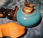 Add a unique touch to your collection with this Lot of 3 Vintage Table Lighters. These pieces boast new wicks and are themed around a charming donkey and a wooden shoe design with turquoise accents. Made in the United States, these lighters are a perfect addition for collectors and enthusiasts alike. The brand, Table Lighter, is known for its quality craftsmanship and attention to detail. Mix up your collection with these one-of-a-kind pieces.