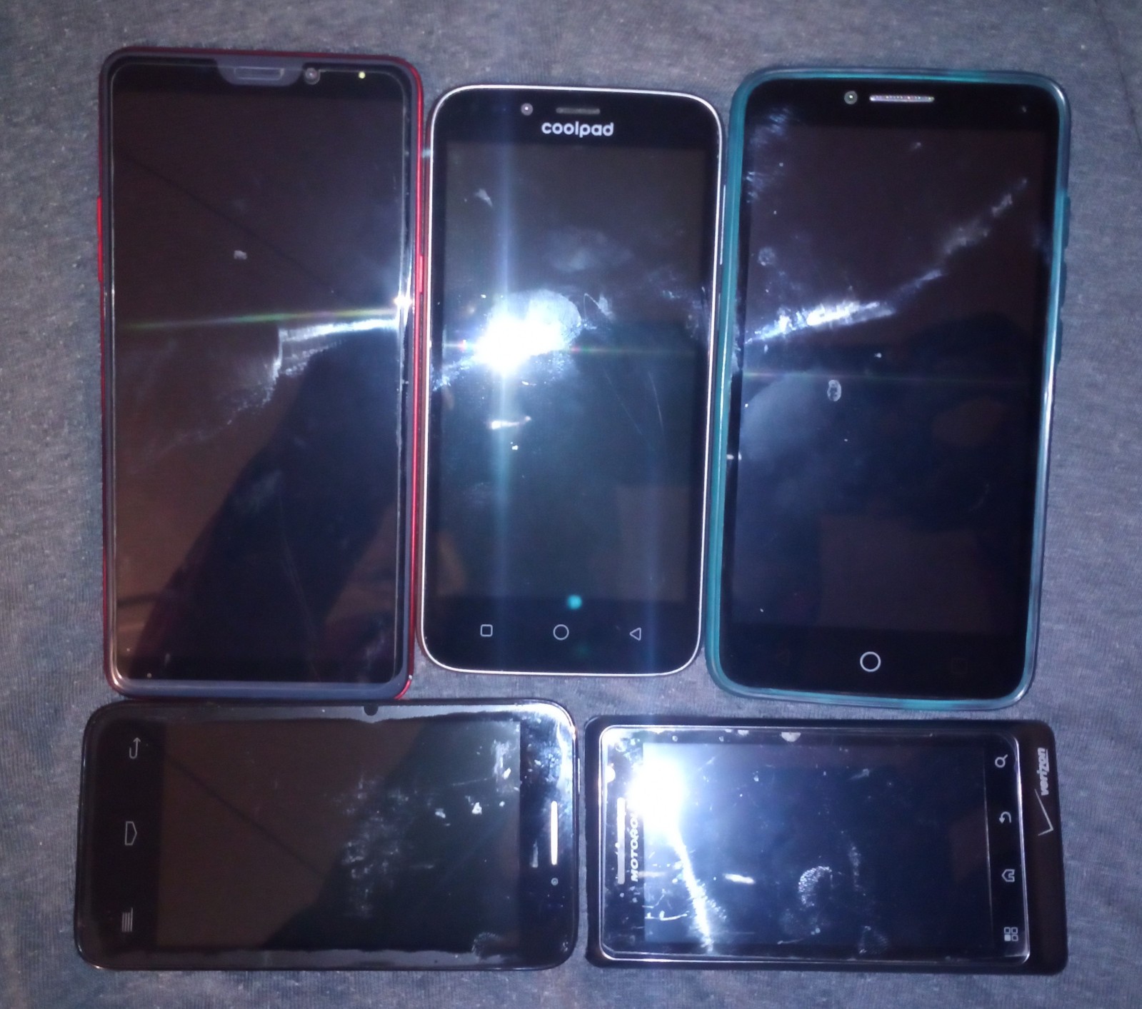 Lot of Android Smartphones X21 Smartphone - Factory Unlocked, Works, Color: Red, 2 SIM slot, 1 memory card slot, 3500mAh removable battery (never used) Coolpad 3632A Smartphone - Metro Locked, Works, Color: Silver, 1 SIM slot, 1 memory card slot, 2450 mAh removable battery (used) Jitterbug (Alcatel) Smartphone - Greatcall Locked, Works, Color: Black, 1 SIM slot, 1 memory card slot, built in battery, case (never used) Alcatel Onetouch Smartphone - Metro Locked, unknown condition, has a removable replacement battery Razr - Slider keyboard smartphone, unknown condition, has a removable battery Phones do not come with service plans, charging cables, wall chargers, sim cards, sd cards or cases (unless listed above). Sold as is, all sales are final. Phones are shipped with batteries that have been drained. USPS Ground Advantage Shipping, buyer pays.