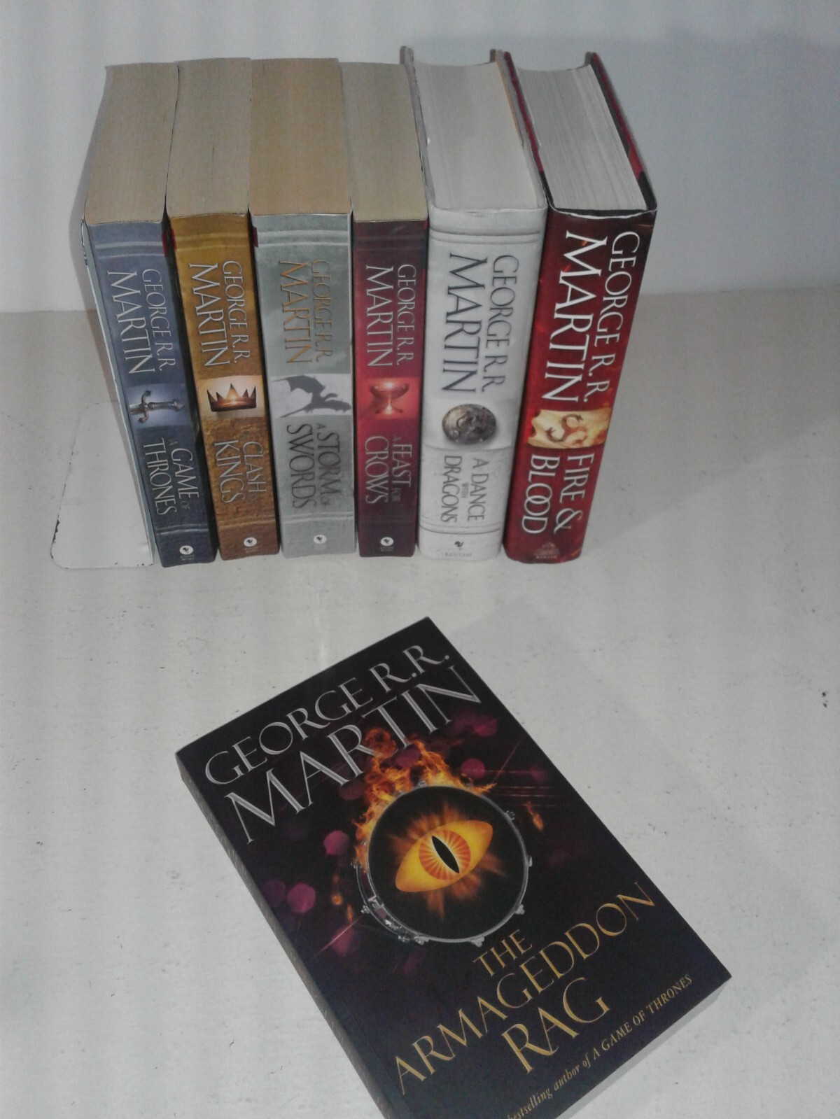 This product is a lot of seven books from the Game of Thrones series by George R.R. Martin, along with the Armageddon Rag. The novels are in both hardcover and paperback formats, with English as the language. The series falls under the genres of action, adventure, war & combat, fantasy, and mystery, catering to young adults and adults alike. Published by Bantam Books, these books are sure to captivate readers with their engaging narratives and captivating storytelling.