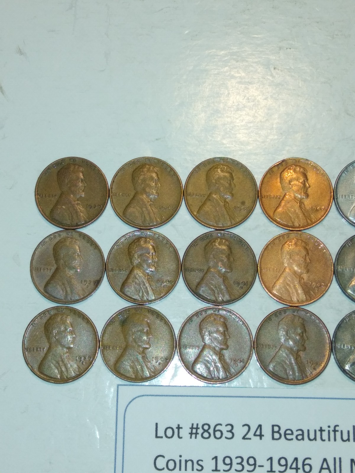 Lot #863 24 Beautiful US Penny Lincoln Wheat coins from 1939 to 1946 the World War 2 years starting in 1939 when Germany invaded Poland with no dates or mints omitted PDS and all in very good to fine condition please see the pictures. This includes the hard to come by 1943 steels PDS. The coins you see in the pictures are the coins you will receive with your winning bid and payment so look closely and see if they meet your expectations. Each of the coins has a readable individual date and letters and all mint marks are in the lot with NO DUPLICATES. The condition of the coins are very good to fine, but you the buyer look at the pictures and see if they meet your expectations. With your payment shipment is 1-3 days in bubble envelope with tracking and insurance and I offer a money back guarantee on all purchases. You can email me any questions that you may have about this auction or any of my auctions on eBay and we do combine multiple purchases. If you use the make offer option all reasonable offs will be considered.