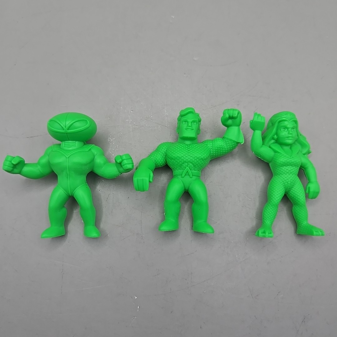 Lot (9) Green DC Comics Superheroes 2" Character Figures from Wendy's- Batman, Aquaman, Nightwing, Catwoman, Black Manta, female Green Lantern, Nubia, Sinestro, & Mera