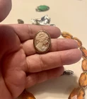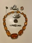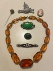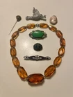 up for offer is a lot of 7 antique and vintage pieces of jewelry , first is a Victorian 10k yellow gold mourning pin brooch set with onyx stones and a seed pearl , second a 16" art deco amber cut glass necklace choker ca 1926 , third is a green celluloid and metal pin ,ca 1928 , fourth is a purple / blue enamel metal pin ca 1928 , fifth is a turn of the century gentleman gold plated stick pin with faux stone made of glass , sixth is a 1960's gold filled shell cameo / pendant brooch in great shape and seventh is a rhinestone peace dove , this is an excellent lot of antique and vintage jewelry , perfect for any occasion, thanks and good luck !