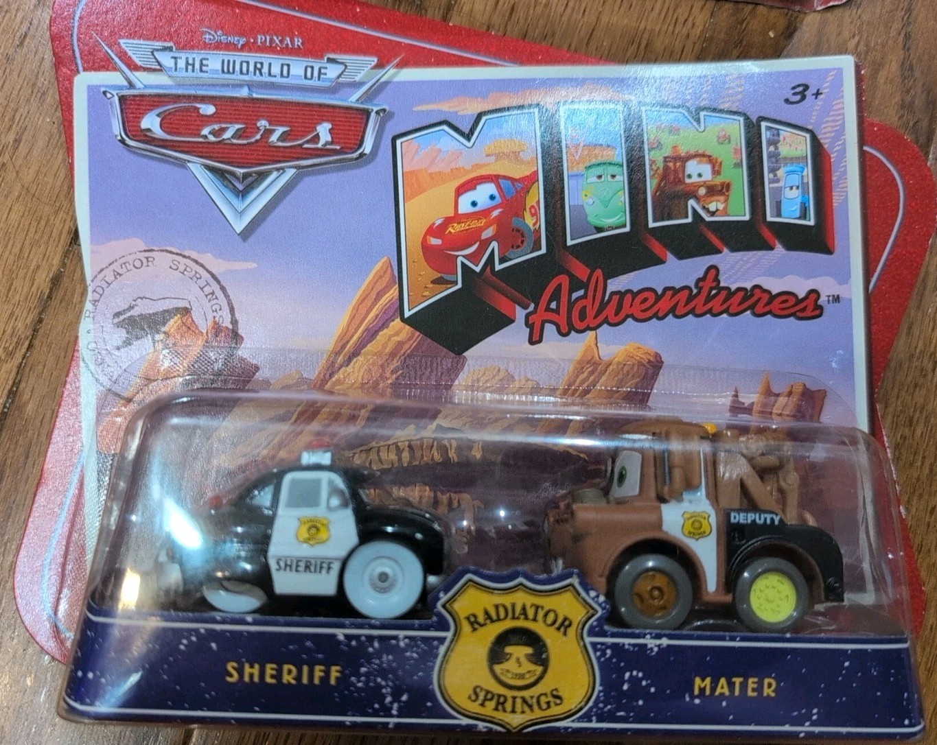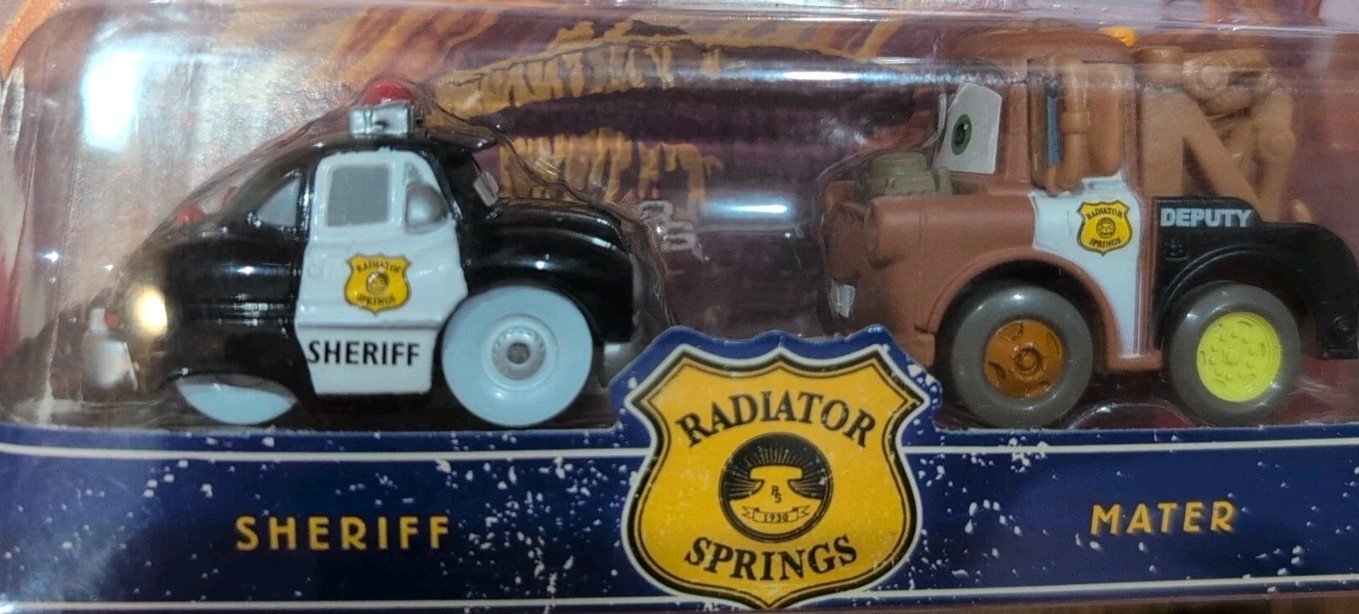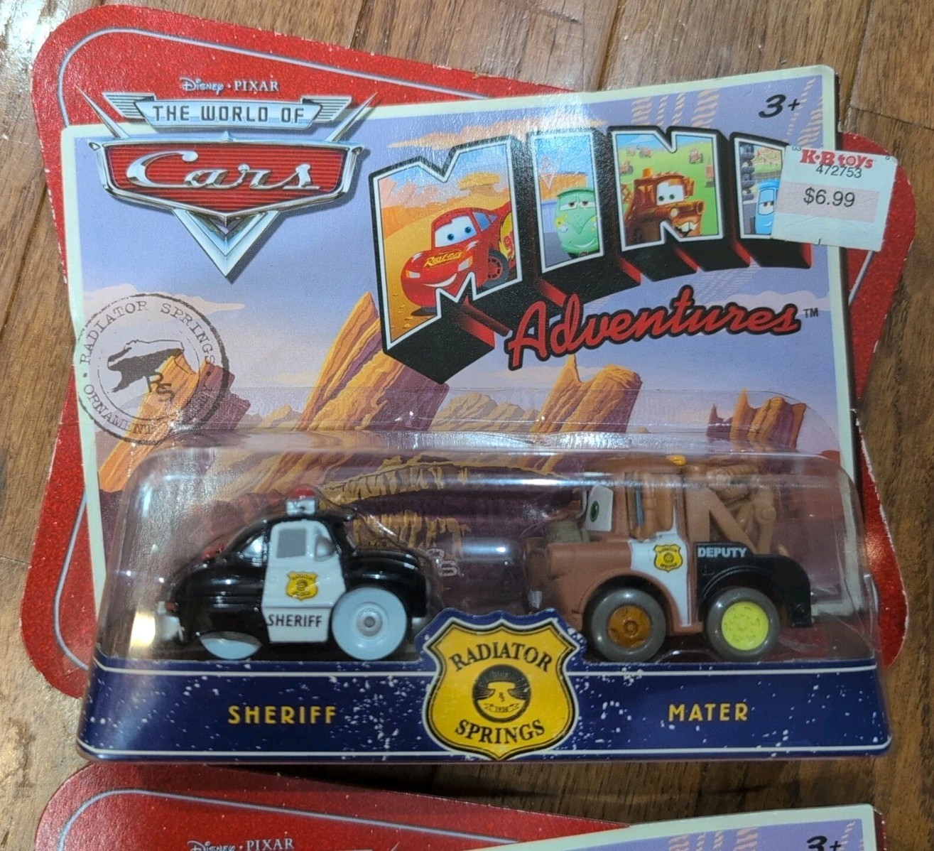Lot Of 2 Disney Pixar Cars Mini Adventures-Radiator Springs Sheriff & Mater New in Packages, old stock.