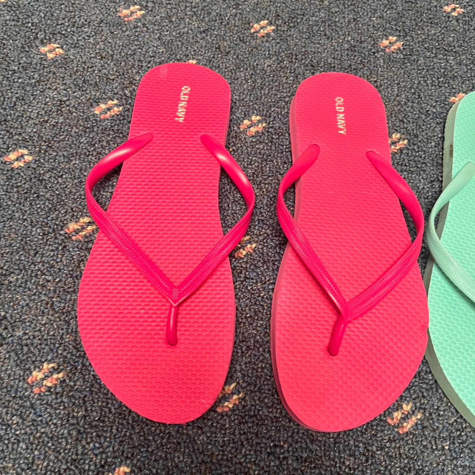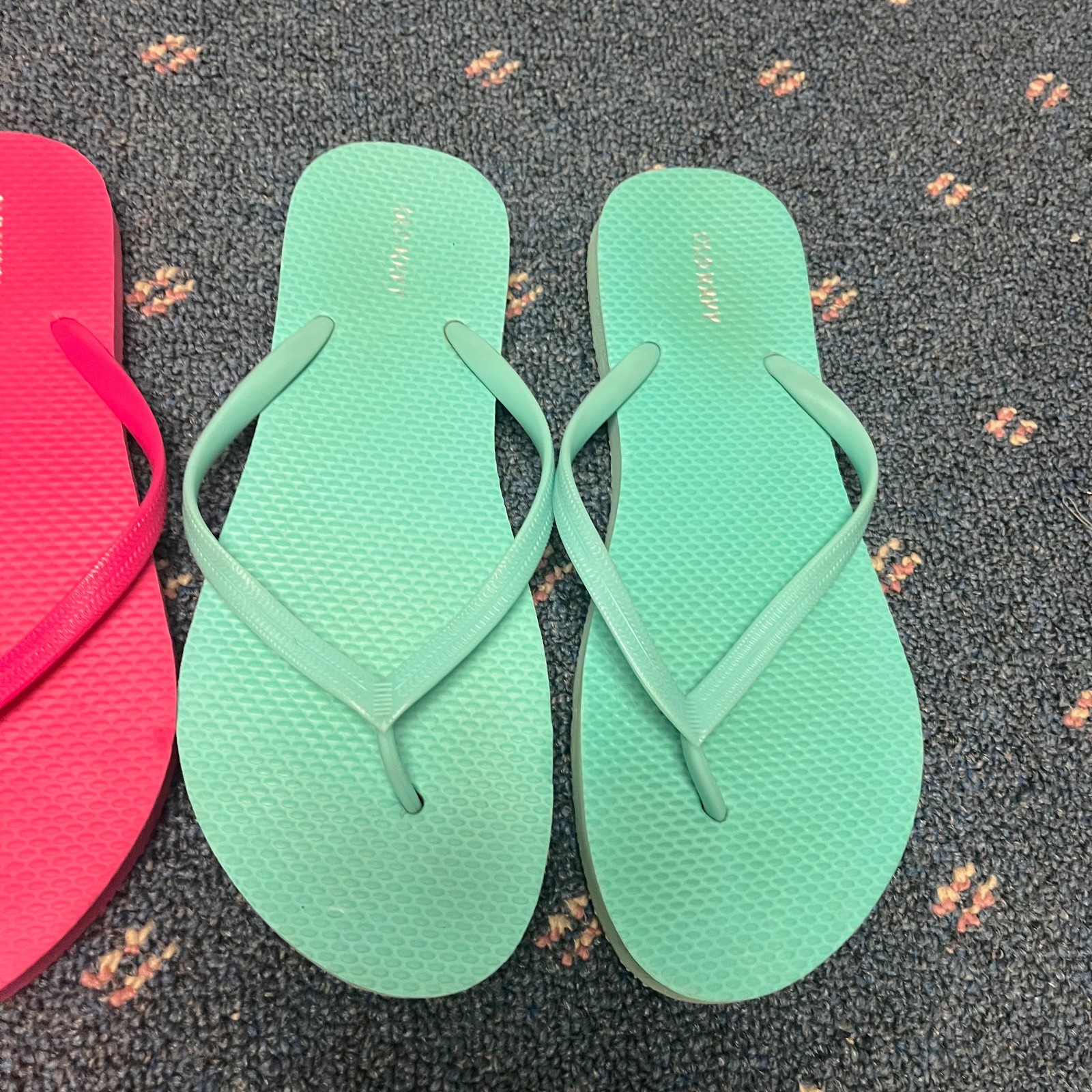 This product is a lot of 2 Old Navy flip flops in women's size 9, featuring a bright blue and pink cotton candy color scheme. These slip-on sandals are designed for casual occasions in the summer season, with a flat heel and thong style. The synthetic lining and outsole provide comfort and waterproof feature, making them lightweight and suitable for outdoor activities. The multicolor design with logo accents adds a trendy touch to these summer sandals from Old Navy.