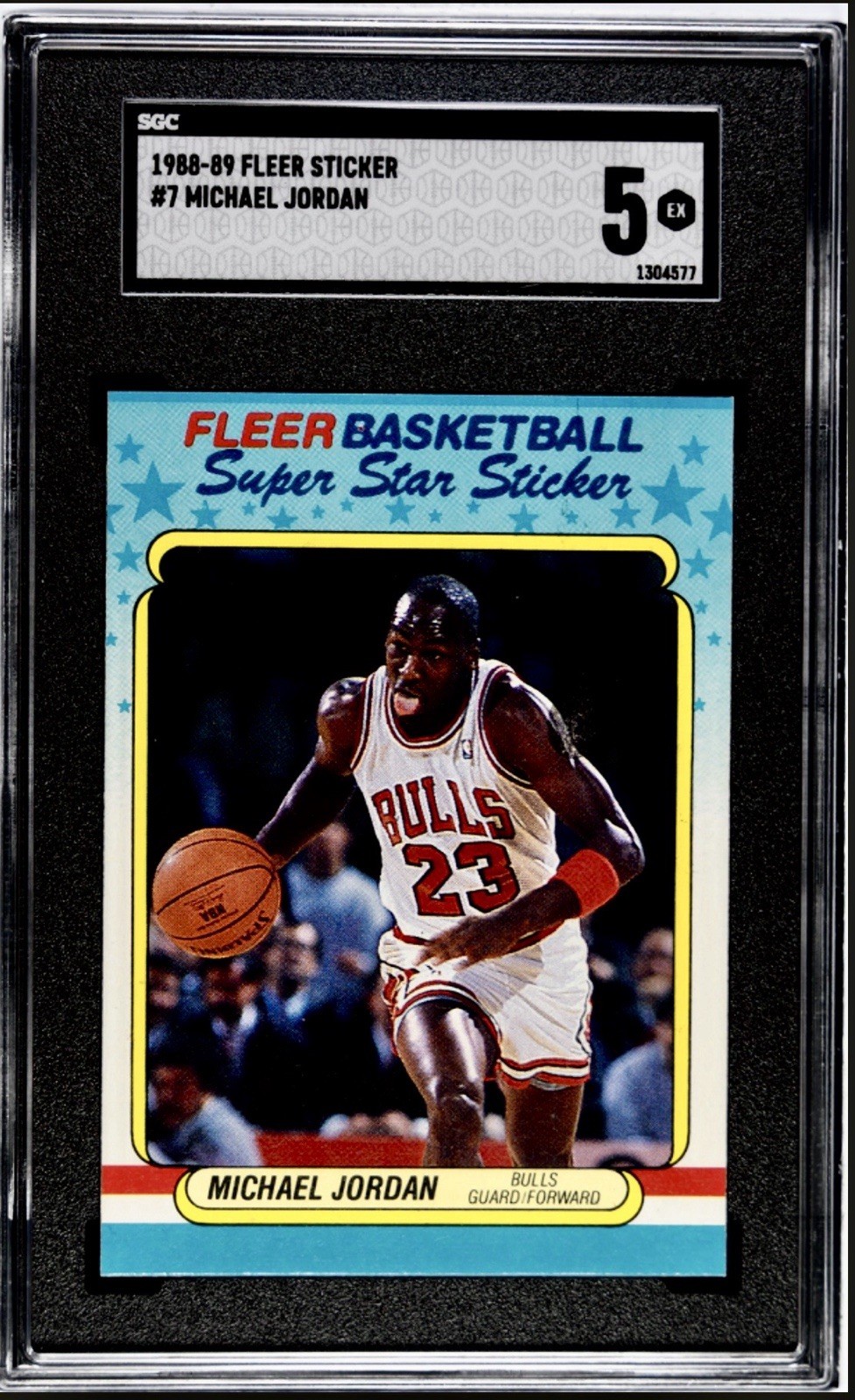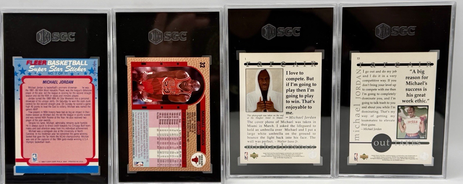 The product is a lot of four high grade Michael Jordan trading cards, all SGC graded and from 1988-1994.These vintage basketball cards feature the legendary player from the Chicago Bulls in the NBA. The cards are original and come from 1988-89:season Fleer sticker #7 graded 5 ,1994 UD Rare Air #53 Gem mint 10 and #1 graded 8.5 and 1992-93 Fleer base #32 graded Mint 9 making them a valuable collector's item for fans of Michael Jordan and basketball trading cards. The cards are in English and manufactured by Fleer, making them a sought-after piece for sports memorabilia enthusiasts.$5.00 shipping domestic